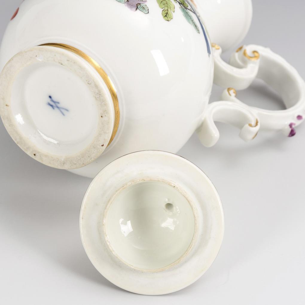 Colorful, gold shaded painting after Famille verte model with two fancy birds on a tree and chrysanthemum flowers. Iron red, purple, capuchin brown and gold painted. Inside the stand ring shaper mark of Johann Gottlieb Kühnel, c. 1702-1774, as his turner mark are called "zwey Nollen", sword mark. Inner lid, handle, spout restored.