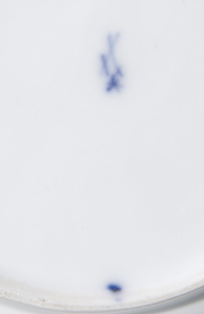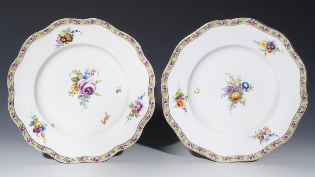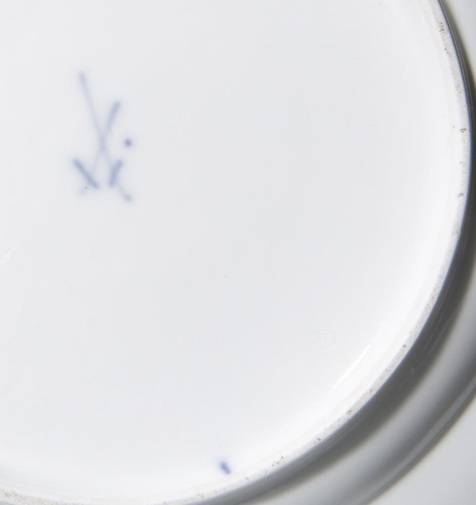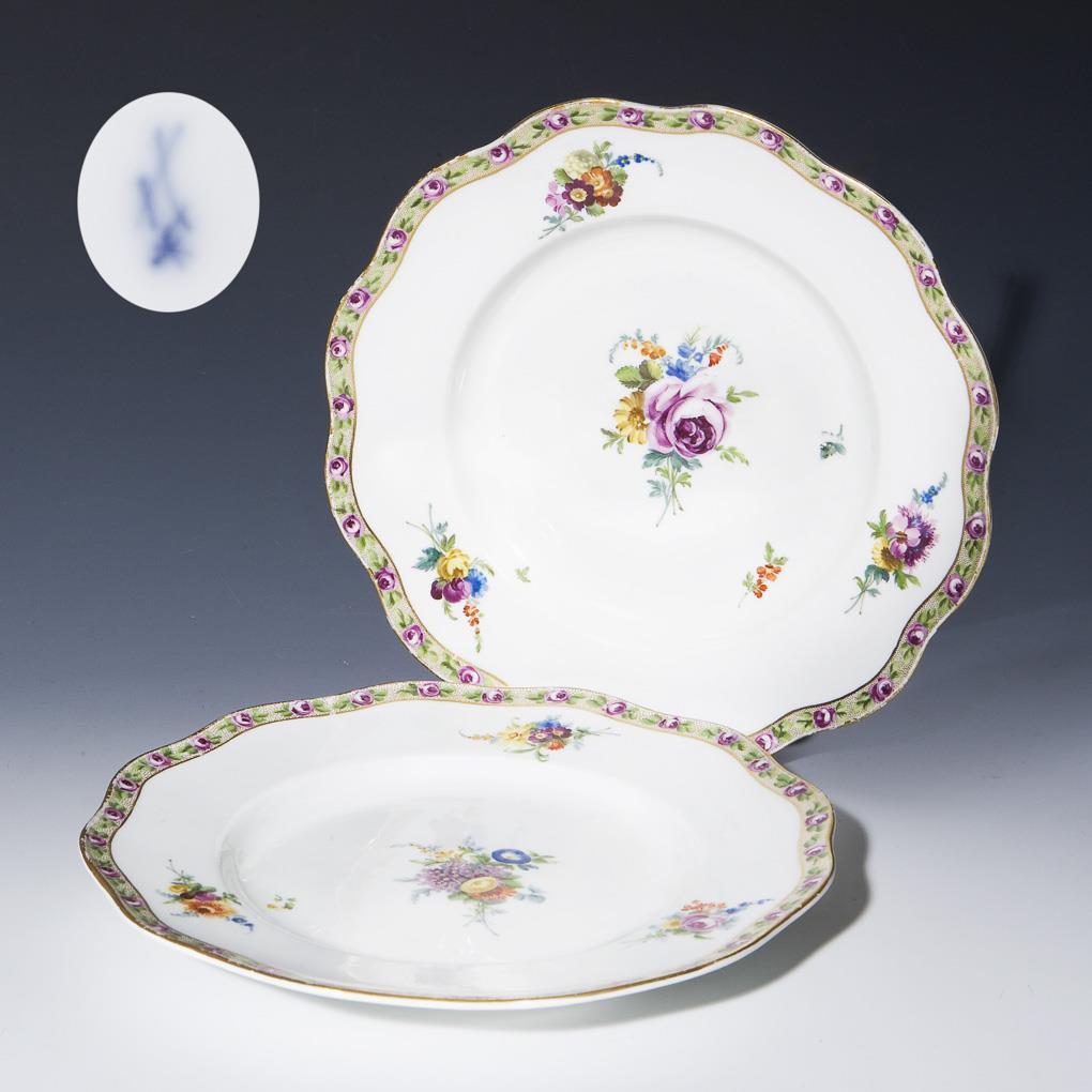 Colorful floral painting, gold staffage, rose borders over dotted gold background, 12-pass curved rim. Sword mark with lateral dot, sword mark with star.
