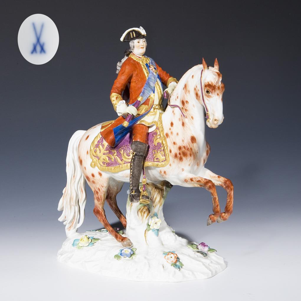 Model by Friedrich Elias Meyer 1752. colored painted, gold staffiert. August III, 1696-1763, as Frederick August II since 1733 Elector of Saxony and as August III King of Poland, Grand Duke of Lithuania, son of August the Strong. Press marks, painter's mark, sword mark. reins bumped, a horse leg glued.