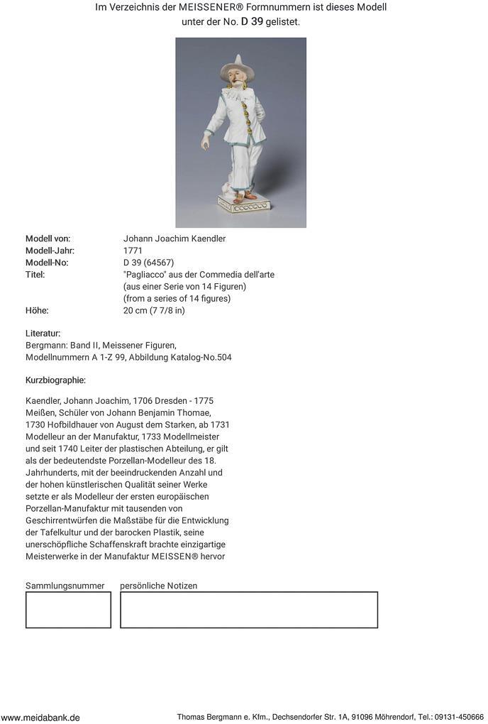 Model by Johann Joachim Kaendler 1771. colored painted, gold staffiert. Pagliaccio makes the audience laugh with bizarre movements, rash and clumsy, later took on romantic features and later developed into the French Pierrot. Incised mark, press mark, painter's mark, sword mark.