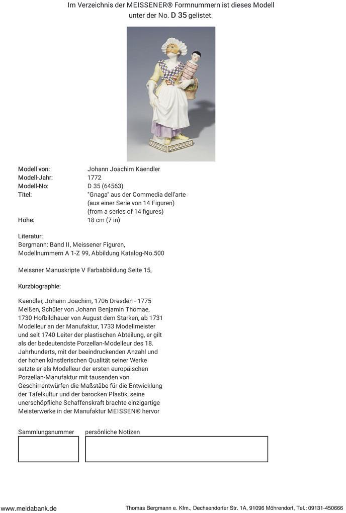 Model by Johann Joachim Kaendler 1772. colored painted, gold staffiert. Kaendler: "The disguised man person so also to the Italian Comedie gehöret Gnaga with the Boppe in the hand holding in her required clothing trained". Incised mark, press mark, painter's mark, sword mark