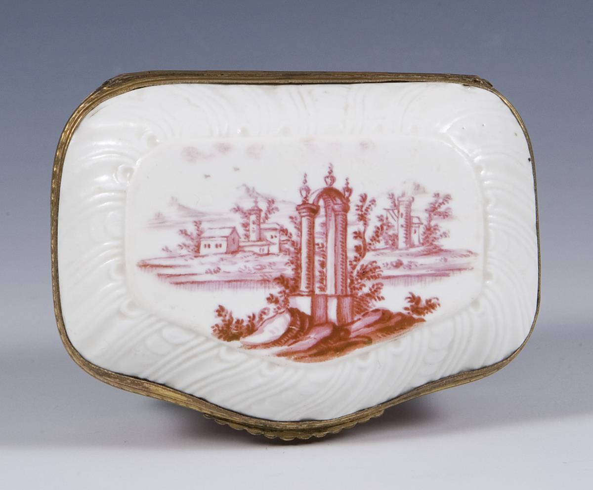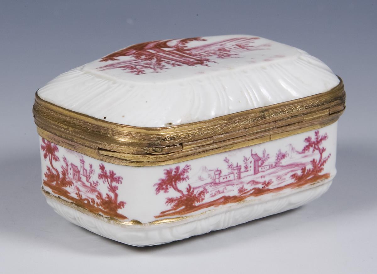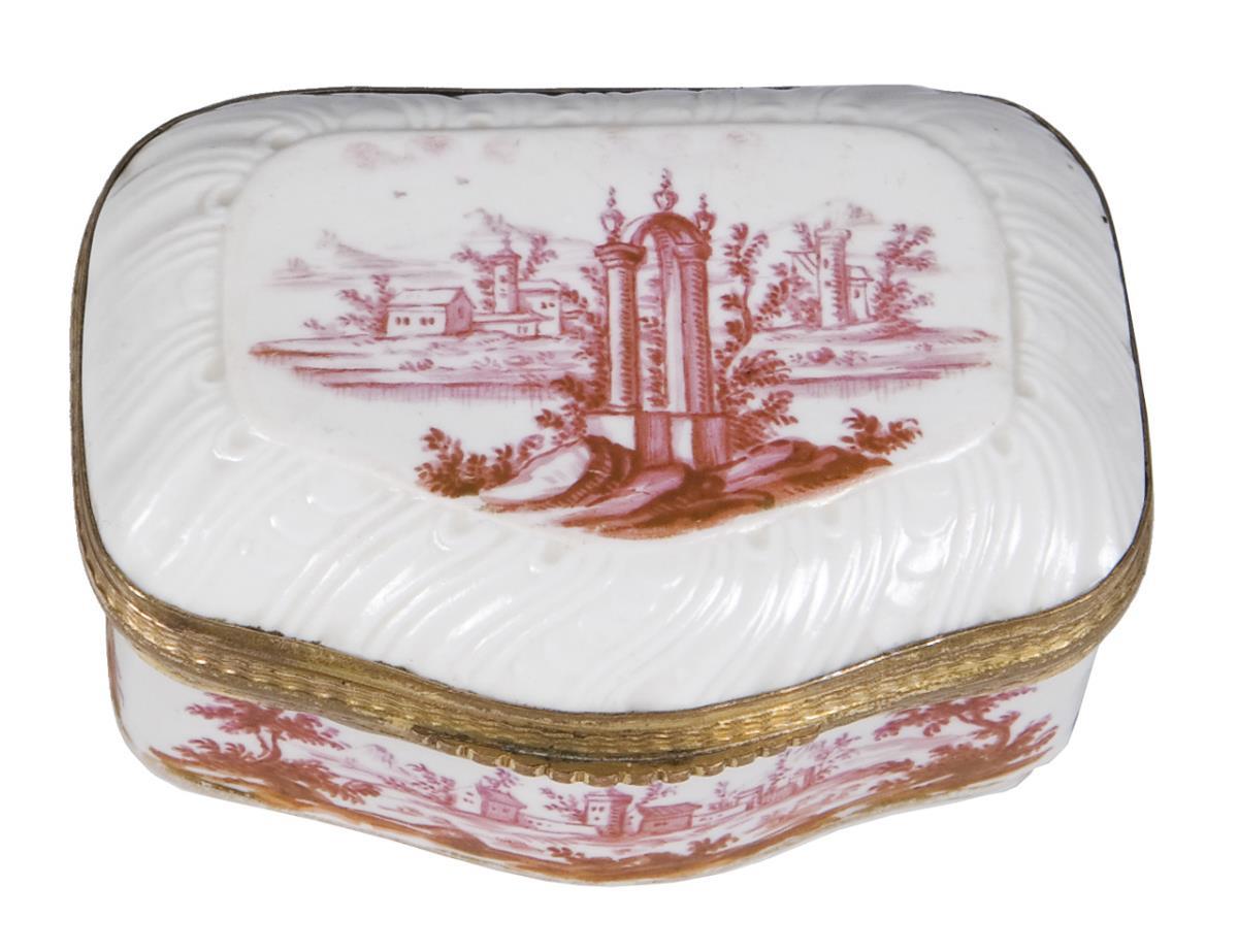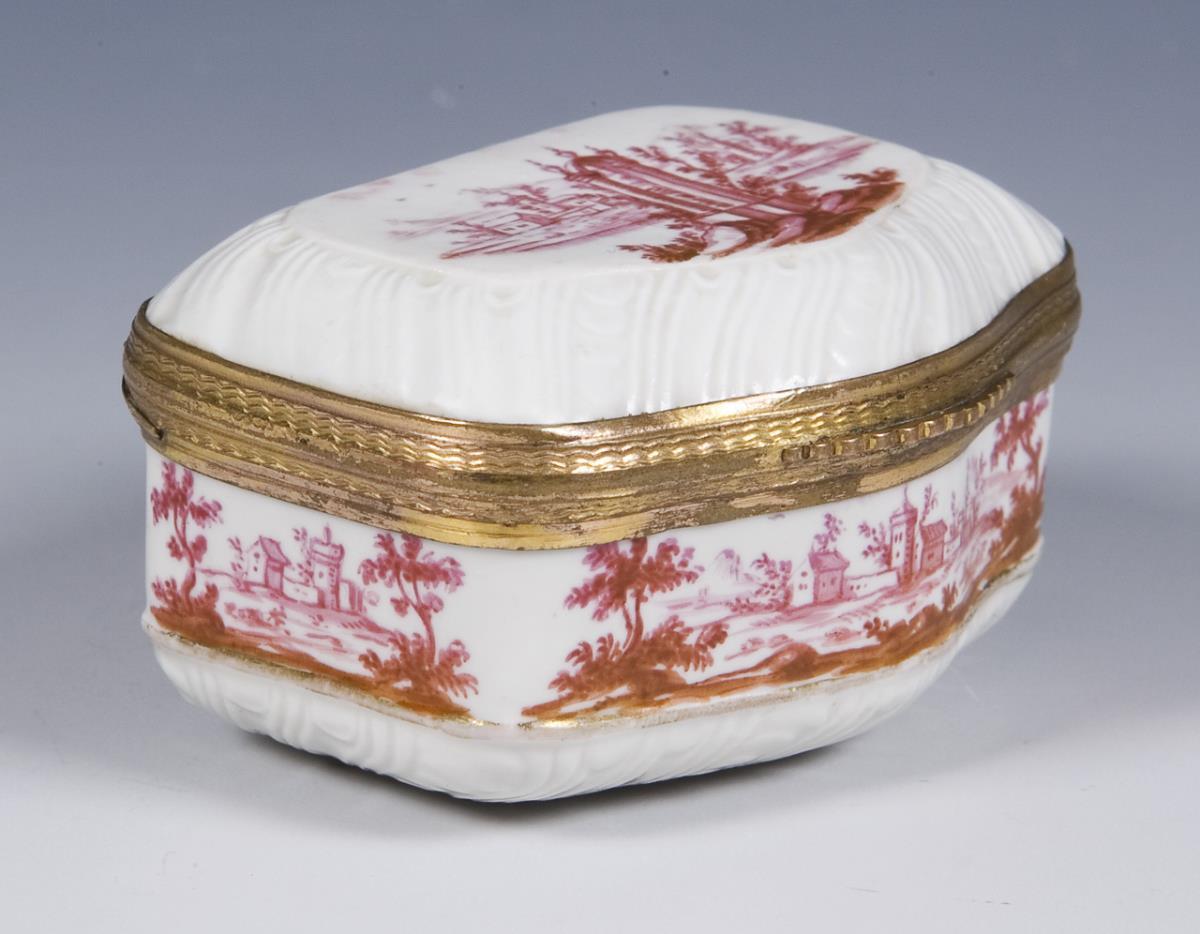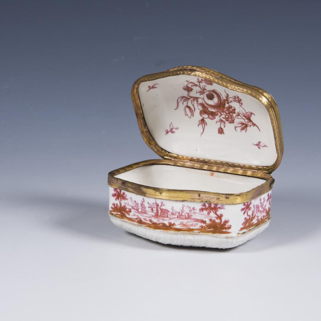 Painting attributed to Johann Andreas Bechdolff. All sides meticulously painted architectural landscapes in purple camaieu. Floral bouquet on the lid. Gilded mount with hinge and thumb grip. At the bottom small glaze defect.