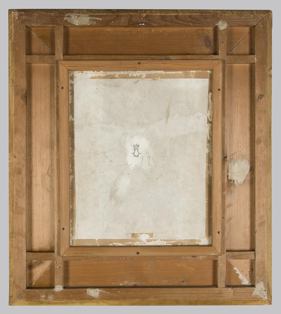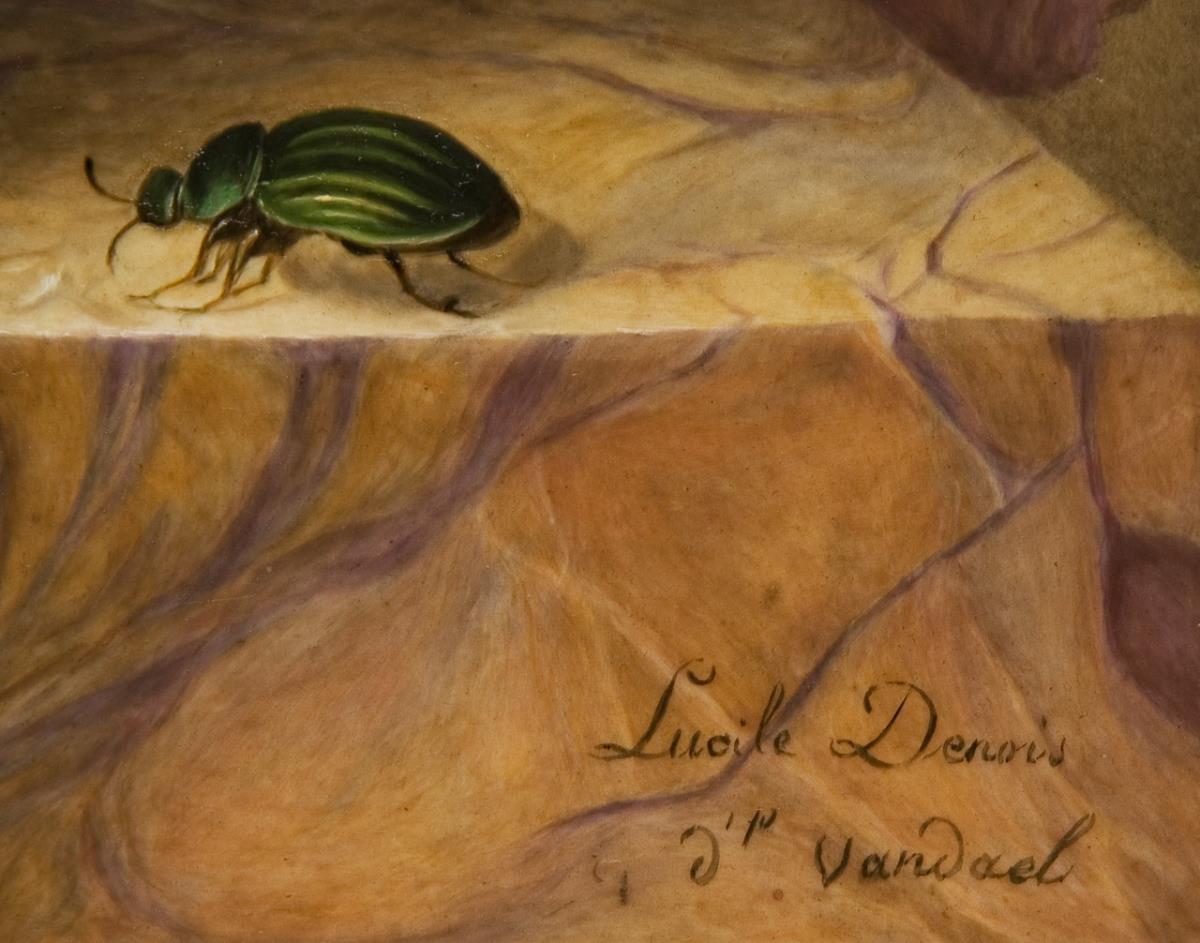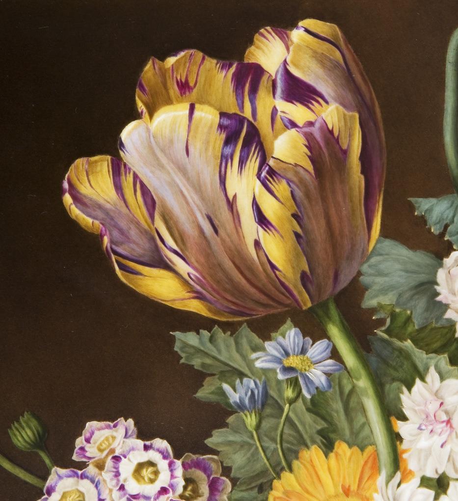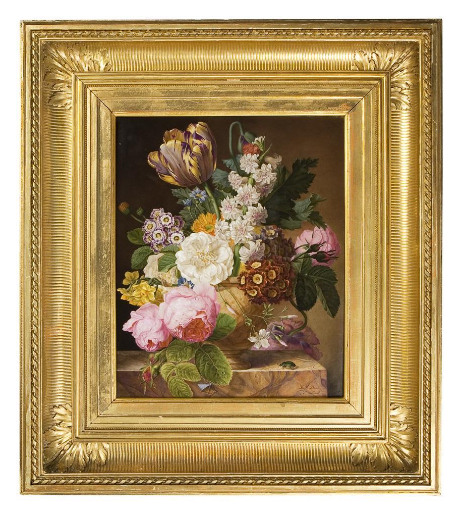 Fine colored painting after the painting template of Jan Frans van Dael (1764 Antwerp - 1840 Paris). Signed: Lucile Denois (worked for Sévres 1820-1827), inscribed. Unglazed bottom, unknown crowned fleur-de-lis mark. Wide gilt ornamental frame. Small chip in the body on the back.