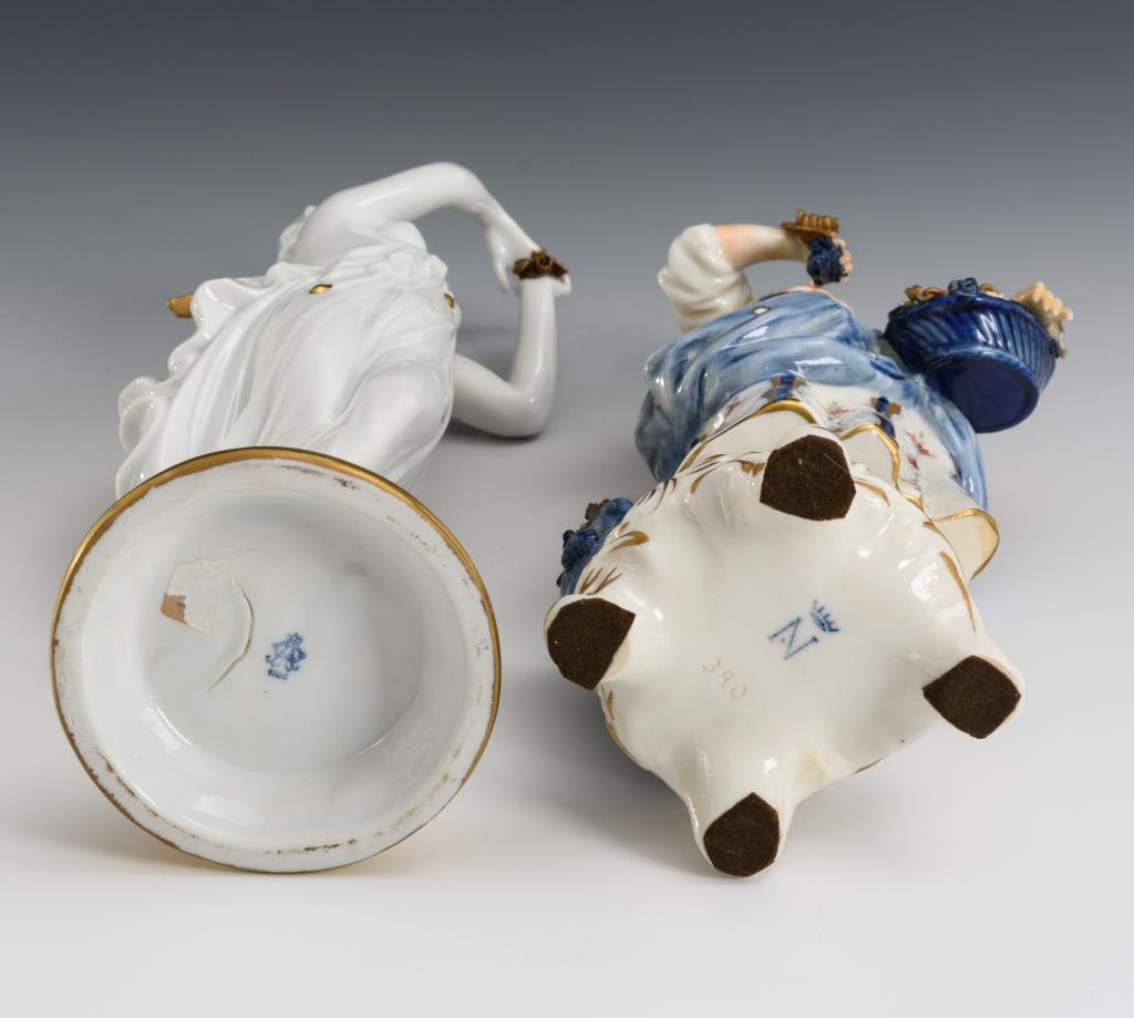 Auf einem Rocaillesockel stehende Winzerin mit Traubenkorb und traubengefüllter Kiepe. / Auf einem Rundsockel in tänzerischer Pose stehende junge Frau mit Rosenblüte.