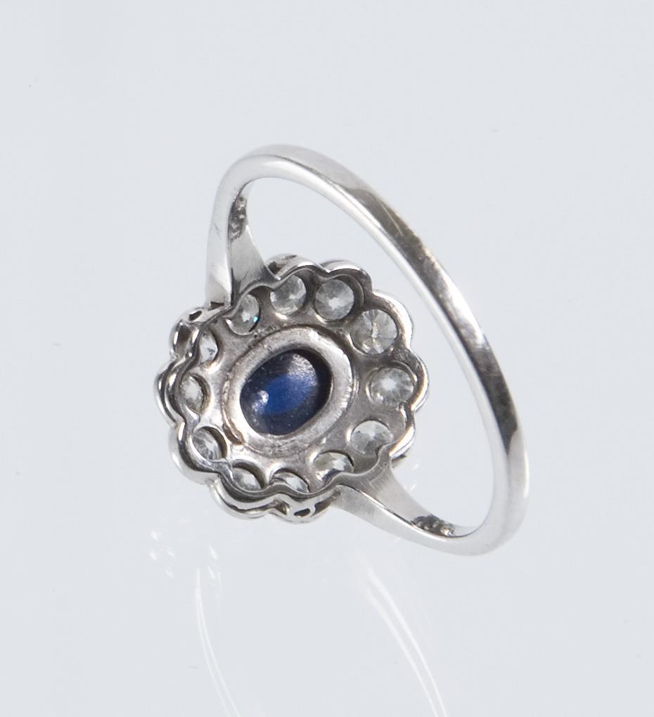 Slim sturdy bar. 1 sapphire cabochon, 12 small diamonds circa 0.36 ct.
