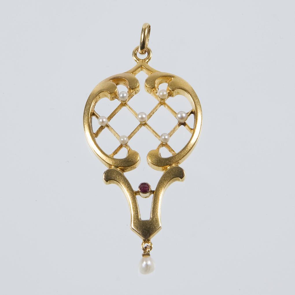 Hallmarks: Fineness, jeweler's mark H.L. 1 small ruby, 8 river pearls, with suspension.
