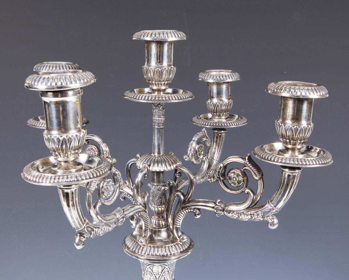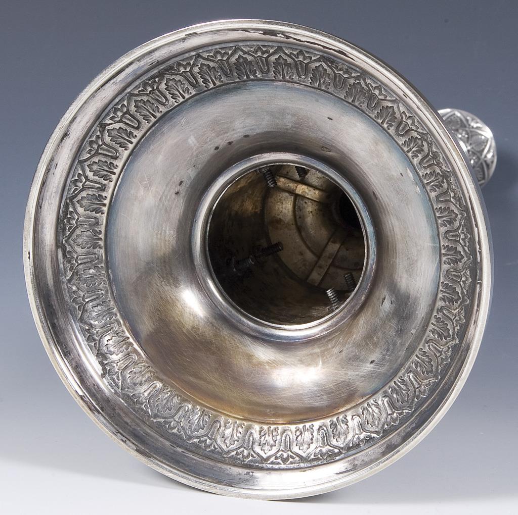 Screwed 5-flame floor standing chandelier with acanthus leaf, palmette, volute and floral decorations. The cylindrical base with four applied antique figures. Without hallmarks, fineness checked with acid, at the base a tremulier mark. spouts, drip trays partially with dents, one spout screw broken off.