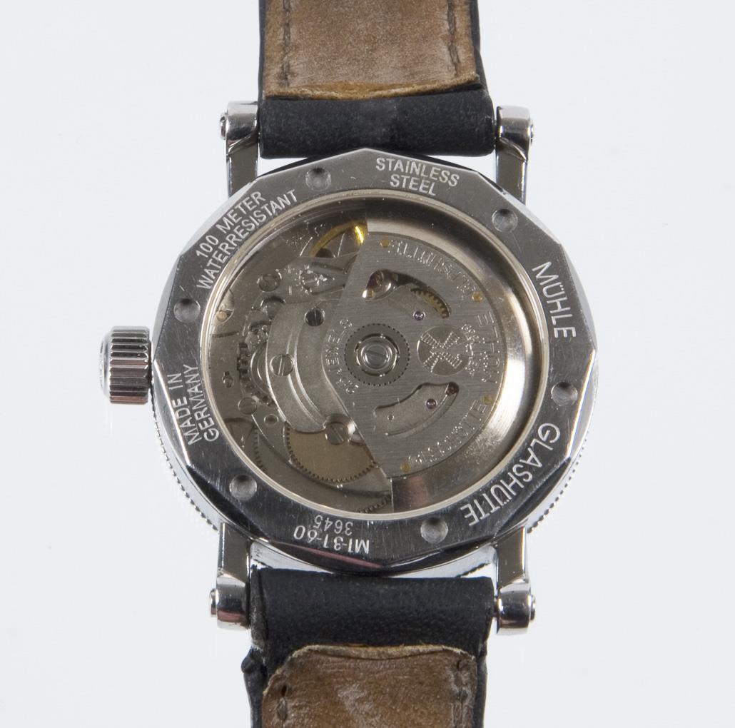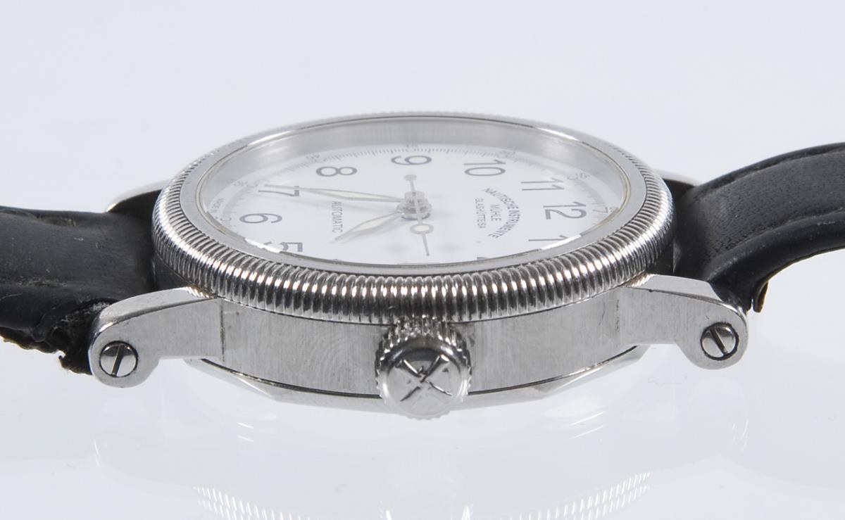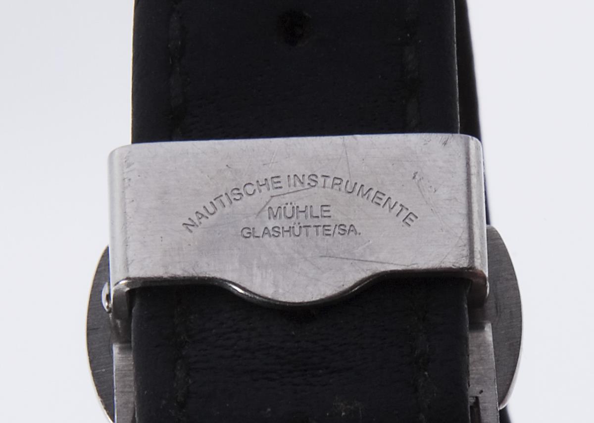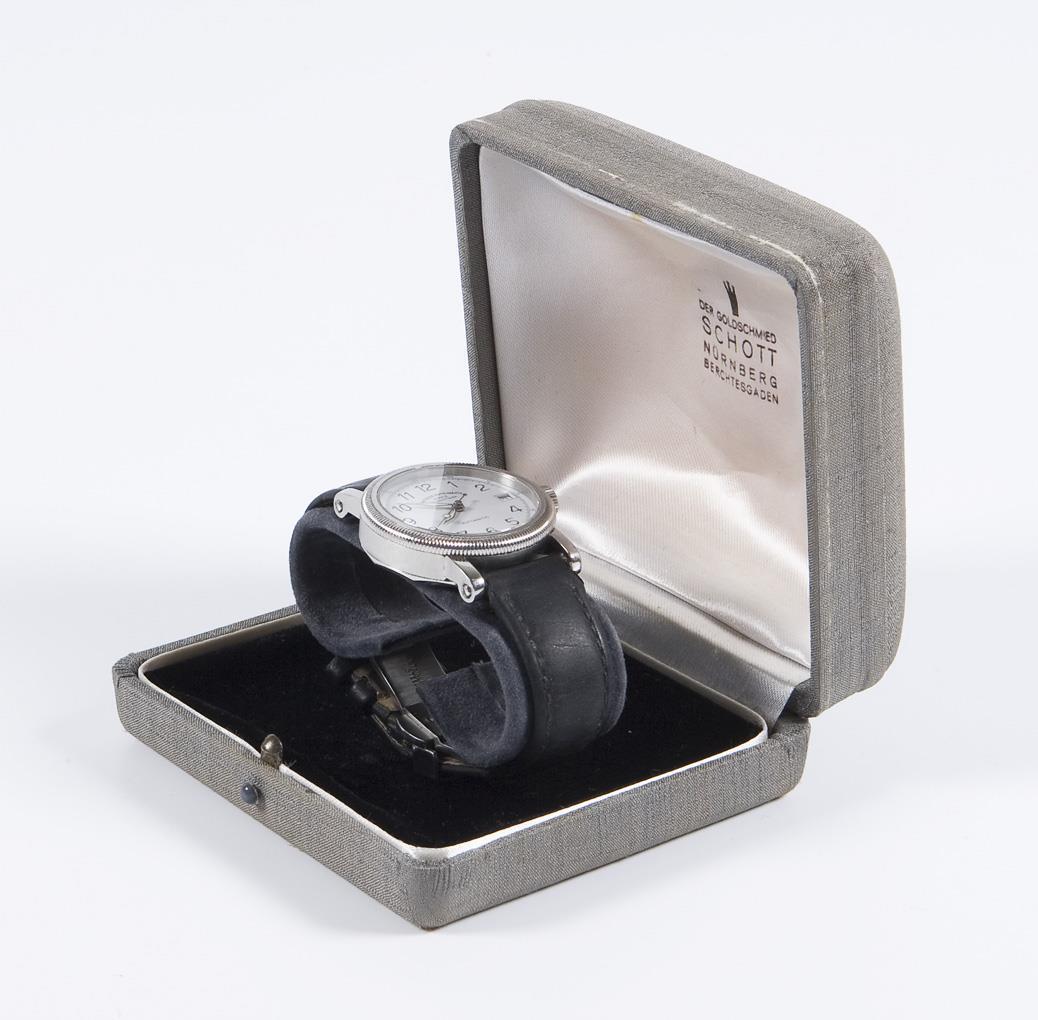 Automatic movement. 25 jewels. Water resistant to 100 meters. Sapphire crystal. White dial, black Arabic numerals, luminous hands. Large seconds, date window. Fluted bezel. Glazed case back. Original leather strap with double folding clasp. Case by goldsmith Schott, Nuremberg. In short time test functional. Leather strap must be renewed, the original folding clasp can be retained, minimal scratch next to the bezel.