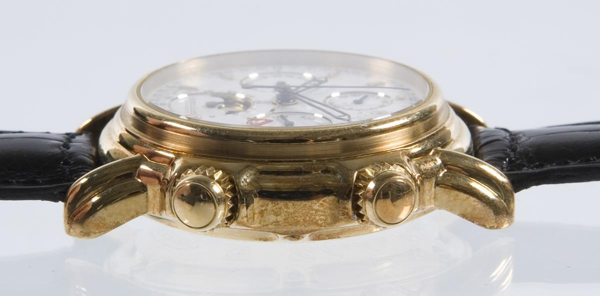 Automatic movement. Power duration 45 hours. Water resistant to 30 meters. Sapphire crystal, white dial, blued steel hands. Subdials for date, day of the week, month, moon phase with 24-hour indication. Large seconds, alarm hand, window with year indicator. Screw down case back. Original leather strap with gold pin buckle. Instruction manual, certificate, original box. In short time test functional. Coating of the box defective.