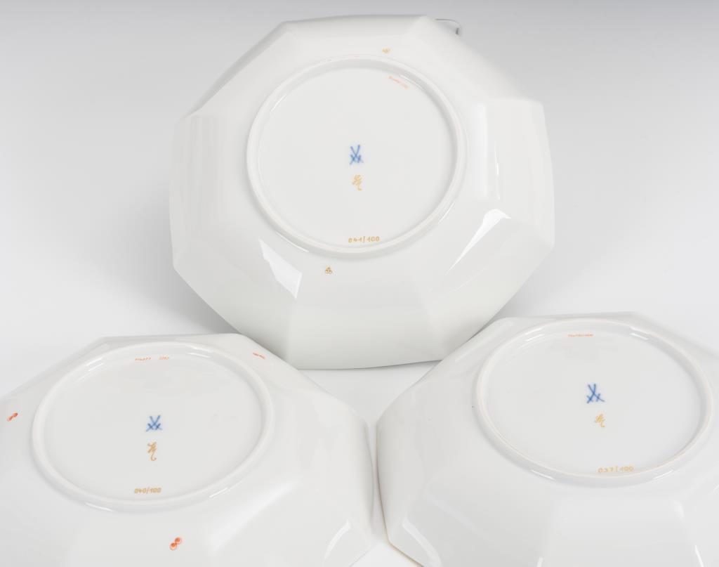 Oktogonale Schalen mit Malerei im asiatischen Stil (Dame im Kimono, Pfau, exotische Vögel).