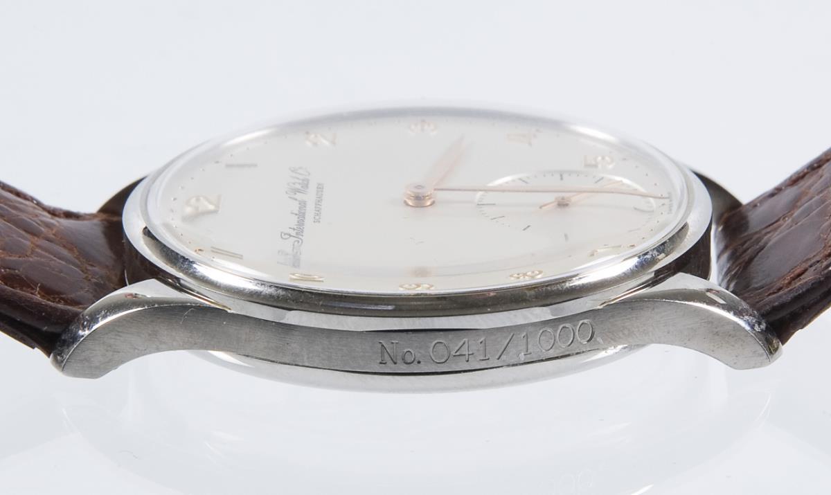 Jubilee edition 1868-1993. manual winding. Caliber 9828. bräcken anchor movements with Geneva stripes. 19 jewels. Limited, numbered. Platinum: 041/250, gold: 041/500, stainless steel: 041/1000. sapphire crystal. Applied Arabic numerals, small seconds, gold hands. Glazed case back. Original leather strap with platinum, gold and steel pin buckle. Original box with combination lock. In short time test functional. Interior coating of the box defective.