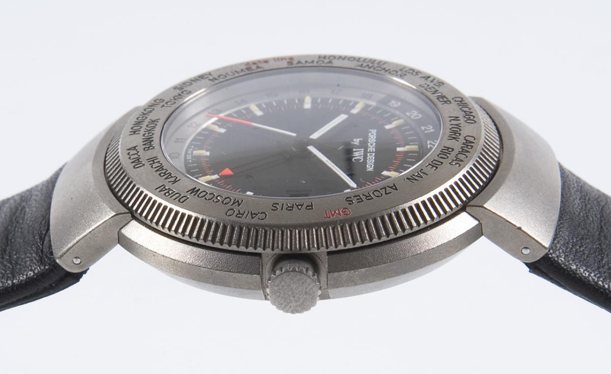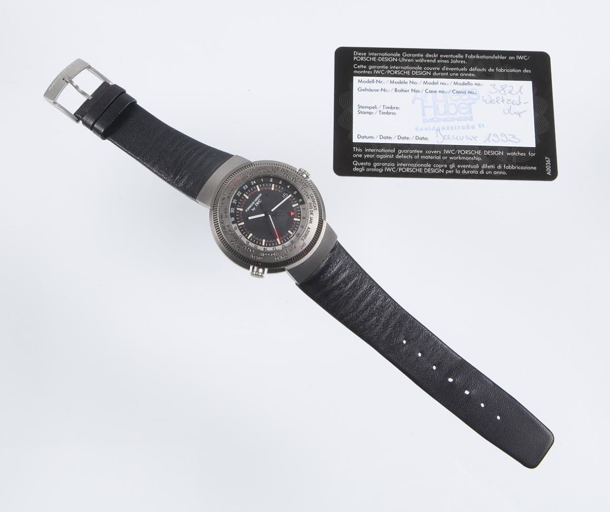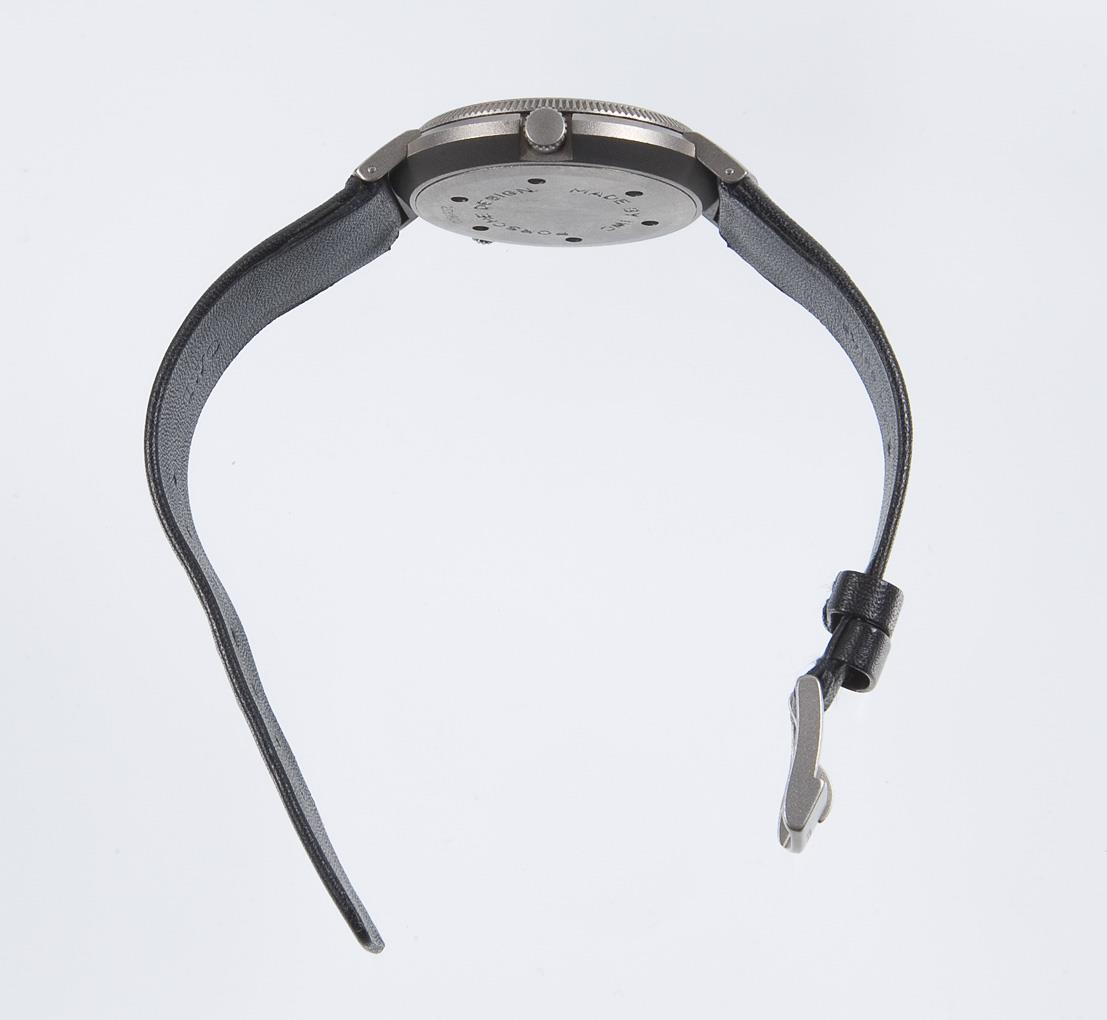 Porsche design. Quartz movement. Caliber 643. shock protected. Water resistant to 30 meters. Sapphire crystal, black dial. Large second hand, alarm hand, date window. Circumferential 24-hour ring. Bezel with city ring moving on both sides. Crown screwed at 8. Original leather strap with pin buckle. Warranty card, instruction manual. Original box, carton. Watch not working, service needed.