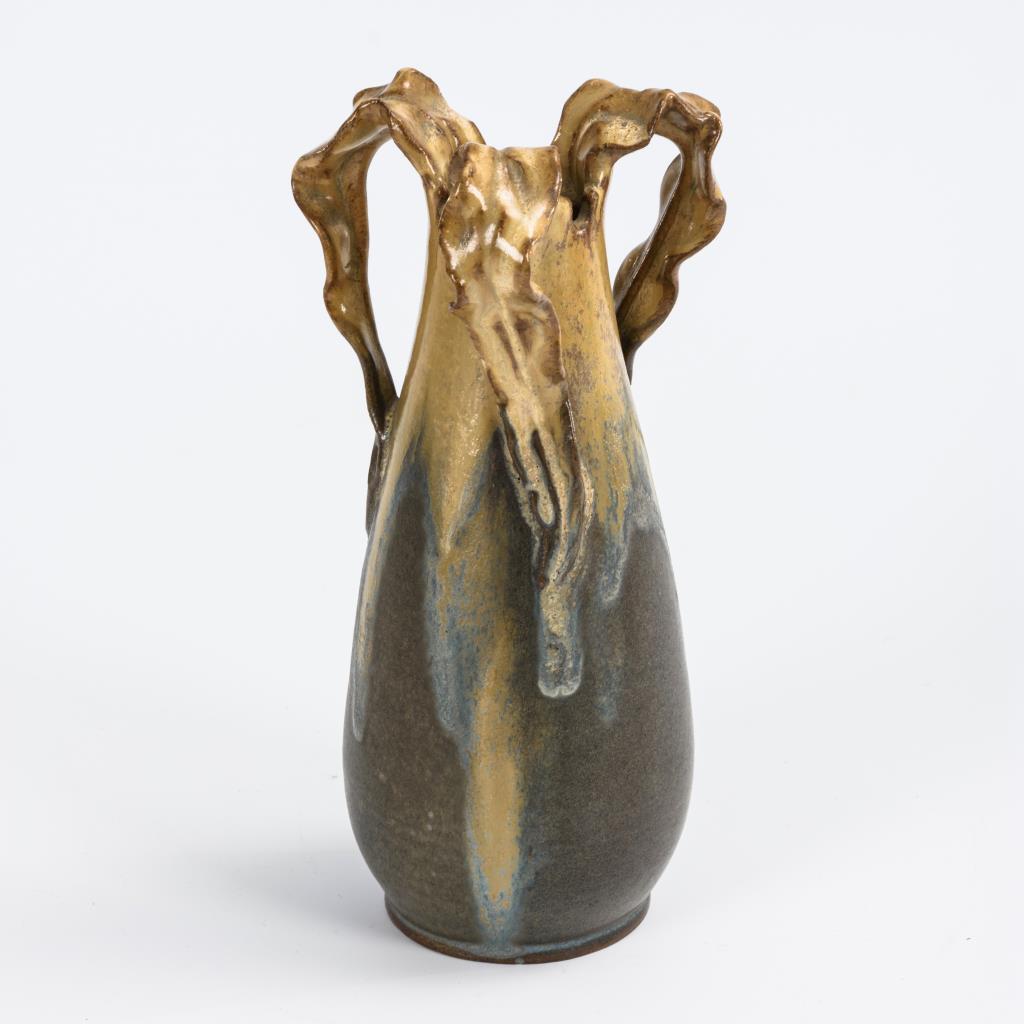 Steinzeug, ockerfarbene Laufglasur auf steingrauem Fond.H 23 cm.