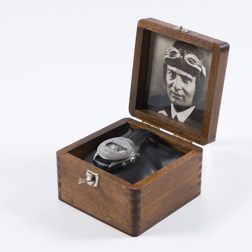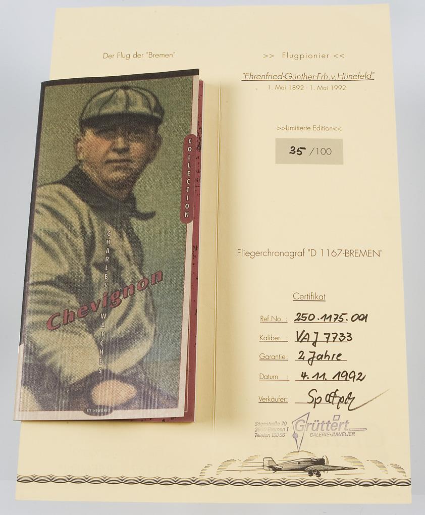Skyhawk model. Limited, numbered: 35/100th Atlantic pilot Ehrenfried Günther Freiherr von Hünefeld. Manual winding. Valjoux 7730 caliber. Water resistant to 100 meters. Black dial, subdials for small seconds, 30-minute counter. Numbers and hands with luminous material. Screw down crown. With steel cover to protect the glass. Original leather strap with pin buckle. Certificate, instruction manual, Chevignon Collection brochure, original box. Functioning in short time test.