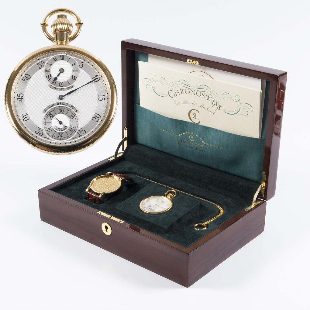 Grand Régulateur pocket watch with watch chain, second case back on bracelet in gold| see supplement. CHRONOSWISS.
