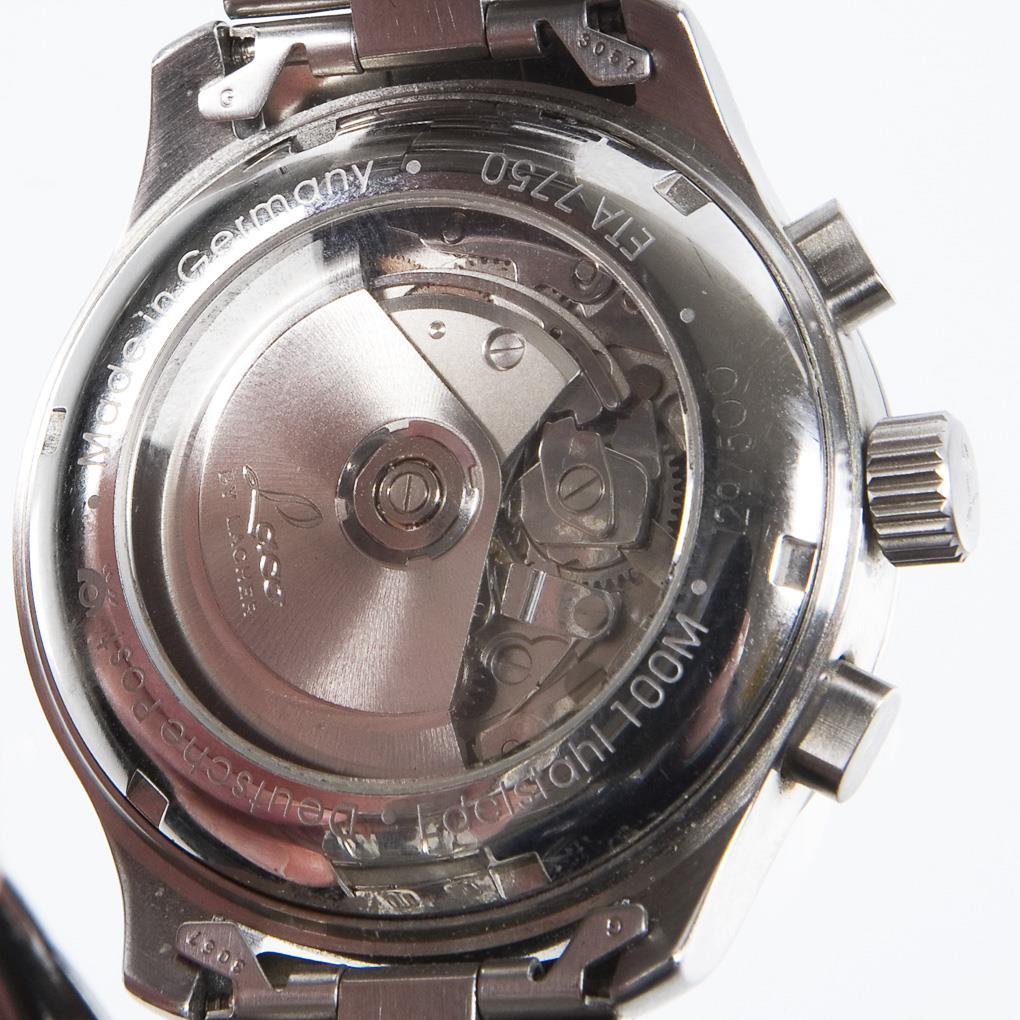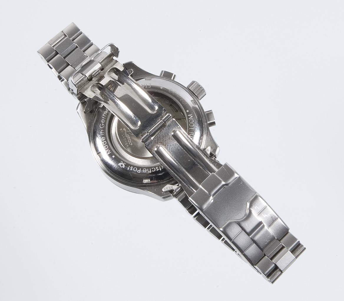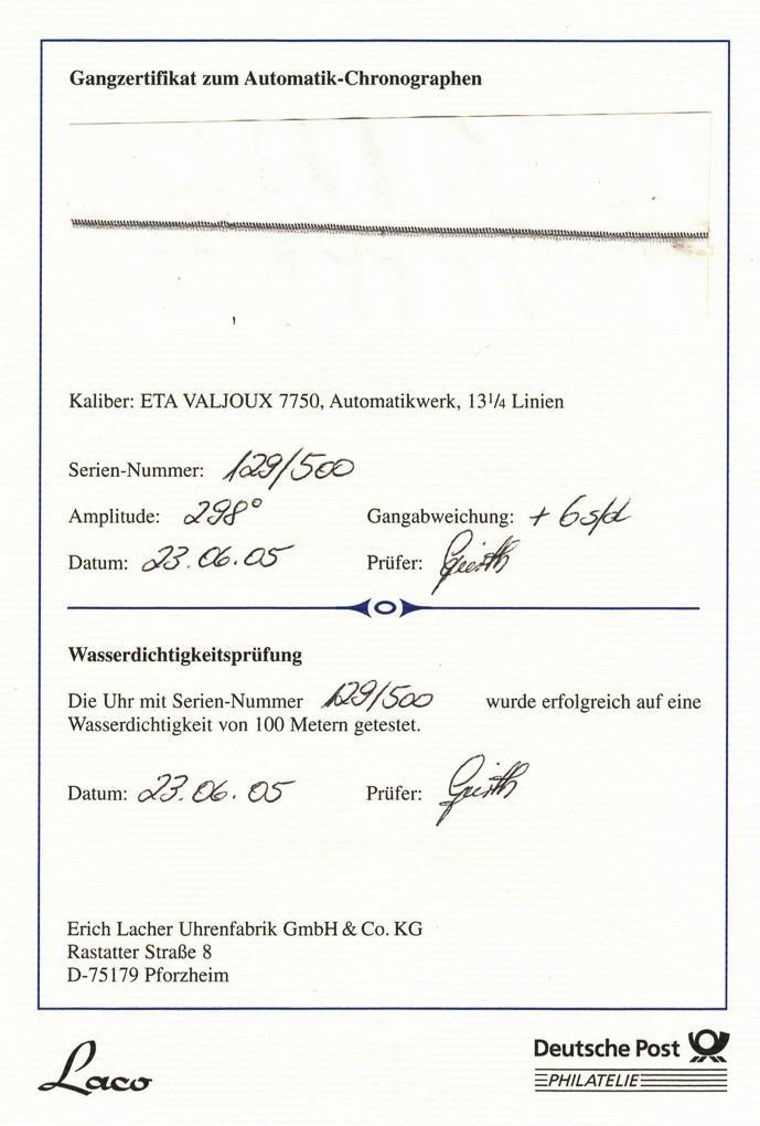 Limited, numbered: 129/500. Swiss automatic movement. Caliber ETA Valjoux 7750. power duration 40 hours. 25 jewels. Shock protected, water resistant to 100 meters. Sapphire crystal, black dial, luminous hands and numerals. Subdials for small seconds, 30-minute and 12-hour counters. Tachymeter scale. Window for day of the week and date. Glazed case back. Bracelet with double folding clasp. Certificate, year of sale 2005, certificate of movement, 4 spare bracelet links. Original box, carton. In short time test functional.