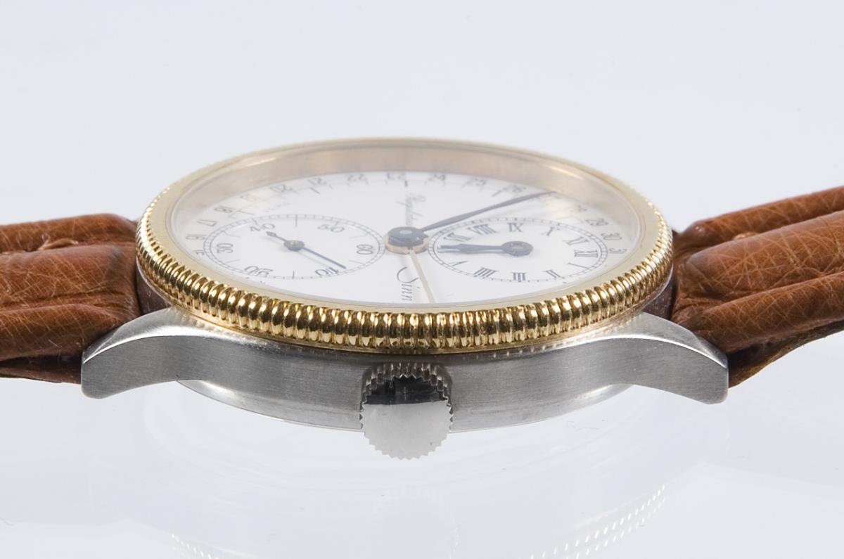 Manual winding. Swiss movement, caliber Unitas 6425. movement with Geneva stripes. 17 jewels. Sapphire crystal, white dial, blued steel hands. Subdials for small seconds and hour indication. Circumferential date display. Glazed case back. Leather strap with pin buckle. Chronoswiss box. The company was founded in 1961 by Helmut Sinn. The pilot decided to have watches made in Switzerland under its own brand and sell them in Germany. In short time test functional.