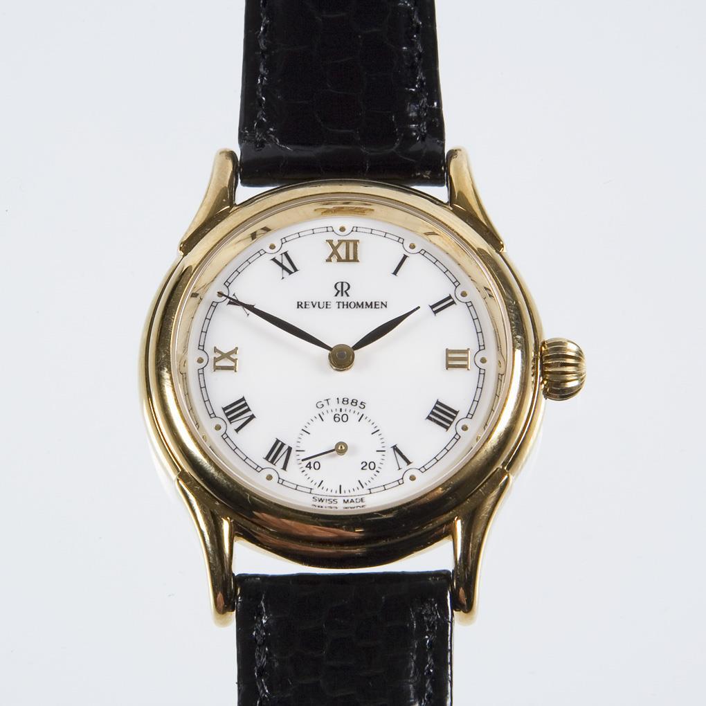 Manual winding. 17 jewels. Water resistant to 30 meters. White dial with gold dots, black Roman numerals, applied gold Roman numerals, small seconds. Glazed back. Original leather strap with pin buckle. Warranty card, year of sale 1992. Functioning in short time test.