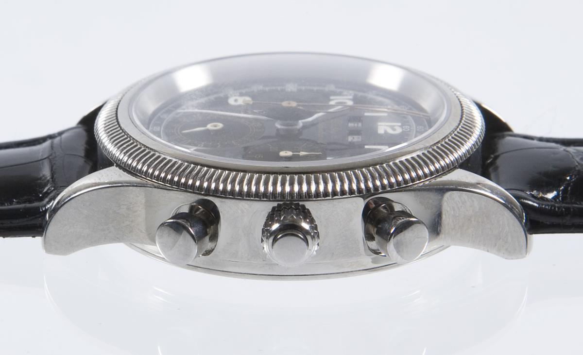 Limited, numbered: 32/100. manual winding. Sapphire crystal, black dial, luminous numbers and hands. Subdials for small seconds, 30-minute counter and date. Window for day of the week and month. Tachymeter scale. Glazed back. Original leather strap with pin buckle. Original box, carton. In short time test functional.