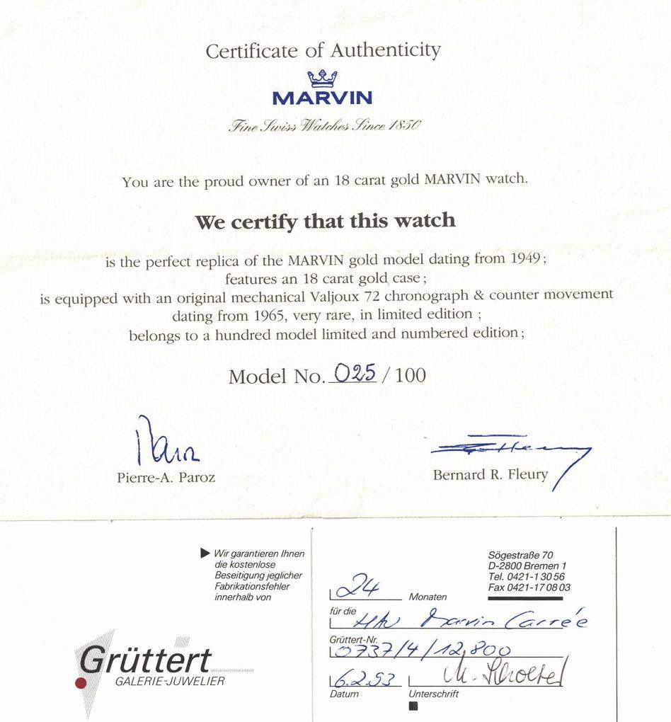 Limited, numbered: 025/100. manual winding. Valjoux 72 caliber. sapphire crystal, white dial, applied gold numerals. Guilloché subdials for small seconds, 30-minute and 12-hour counters. Original leather strap with gold pin buckle. Certificate, warranty card. Original box, carton. Functional in short time test.