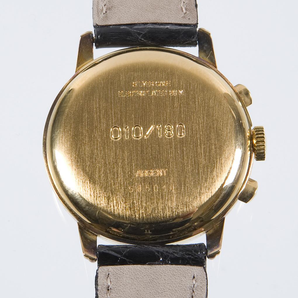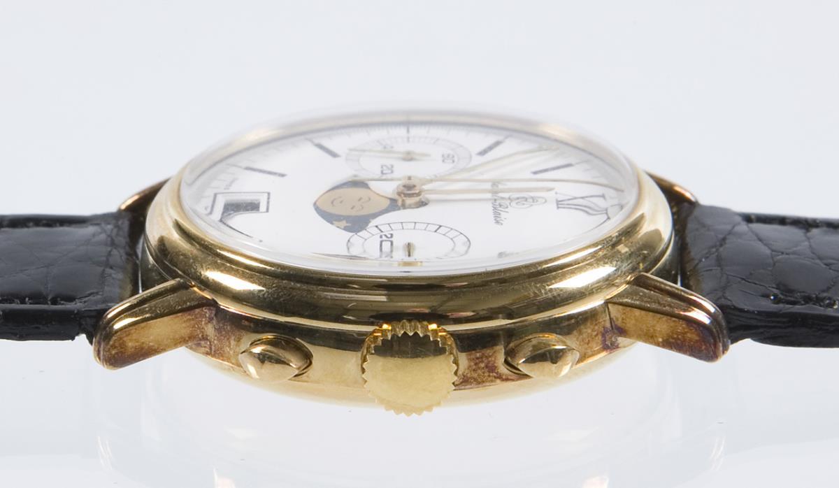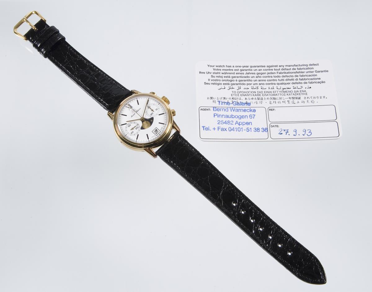 Limited, numbered: 010/180. manual winding. Valjoux 7734 caliber. 25 jewels. White dial. Date window, subdials for small seconds and 30-minute counter. Moon phase. Leather strap with metal pin buckle. Warranty card, instruction manual. Neutral wood box. Functional in short time test.