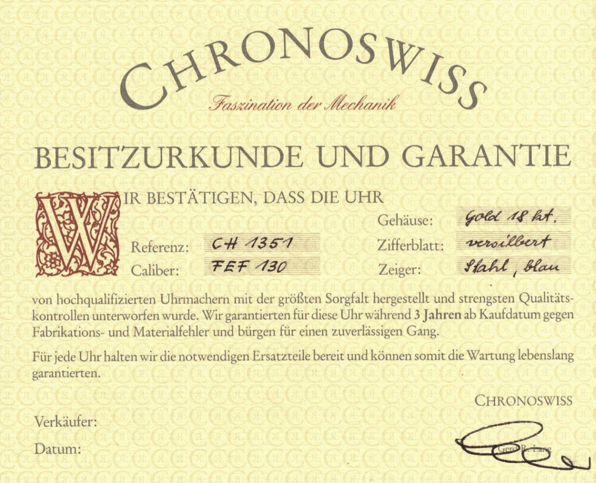 Limited, numbered: 251/700. manual winding. Swiss caliber FEF 130. movement with Geneva stripes. 15 jewels. Sapphire crystal, silvered dial, applied Arabic numerals, blued steel hands. Window for hour indication. Small seconds. Screw down glass case back. Chronoswiss leather strap with metal pin buckle. Certificate of ownership and warranty. Functioning in short time test.