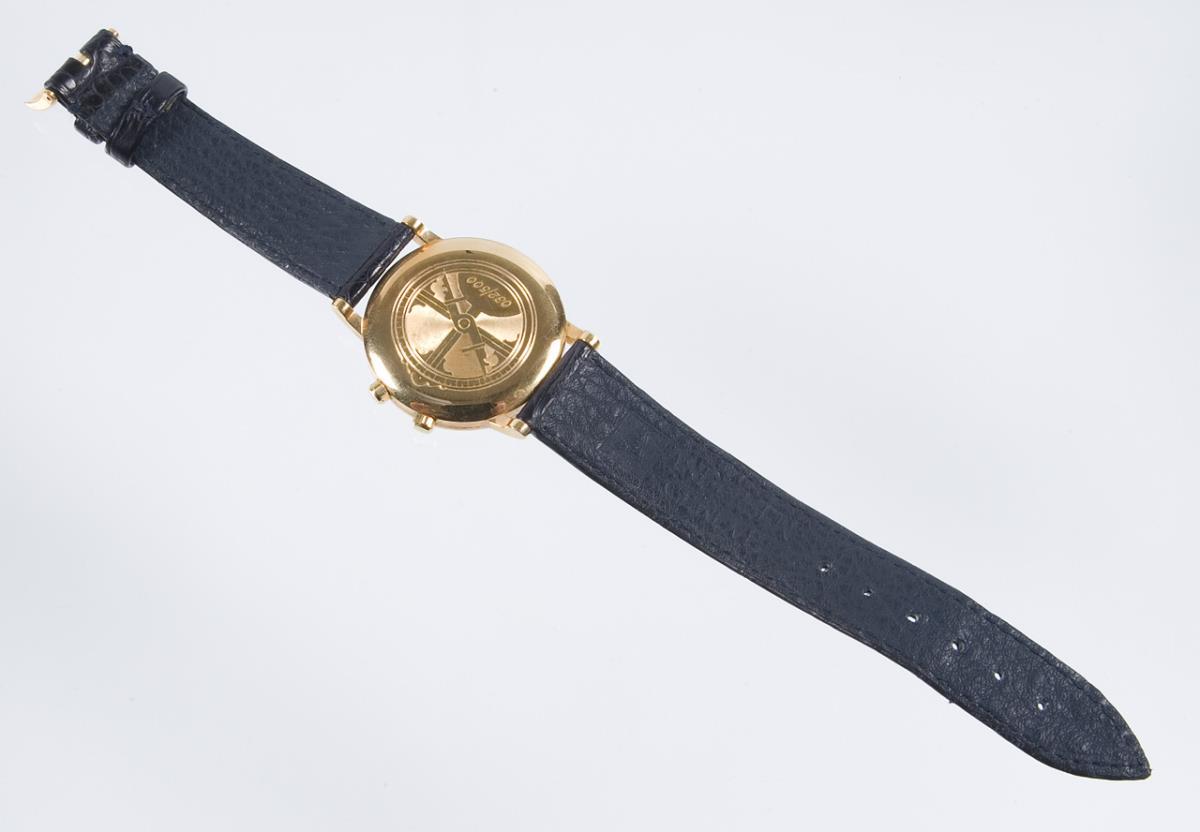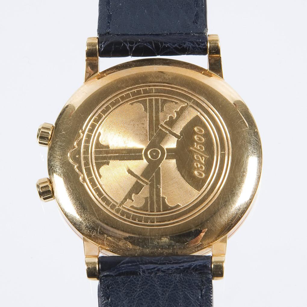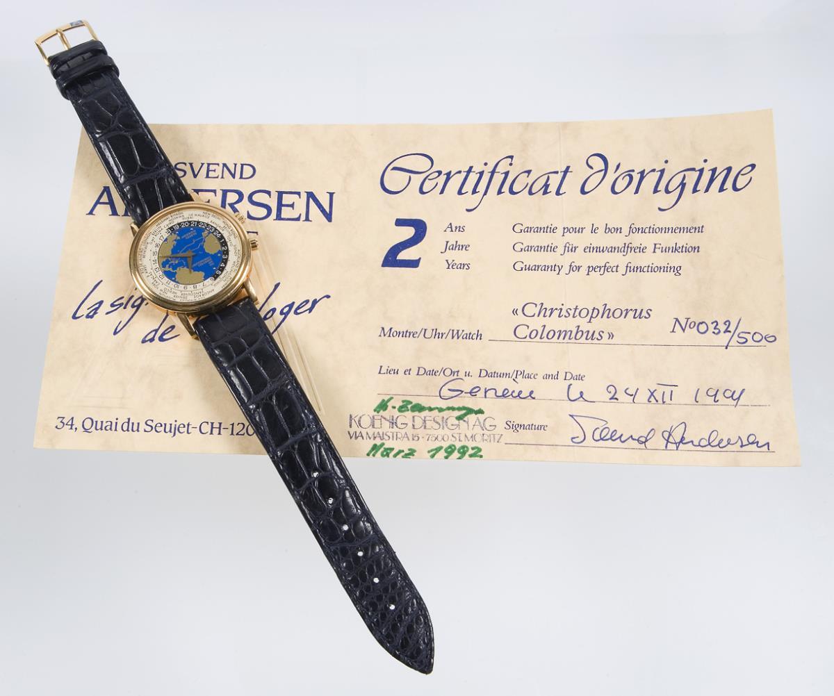Limited, numbered: 032/500. Piguet automatic movement. Waterproof. Back with engraved astrolabe, center dial painted blue with Europe and America in gold. Original leather strap with gold pin buckle. Certificate, instruction manual in copy. Andersen, born in Denmark in 1942, watchmaker. Worked for Patek Philippe among others, self-employed in Geneva since 1978. Known for the pure craftsmanship of wristwatches and pocket watches in small series.