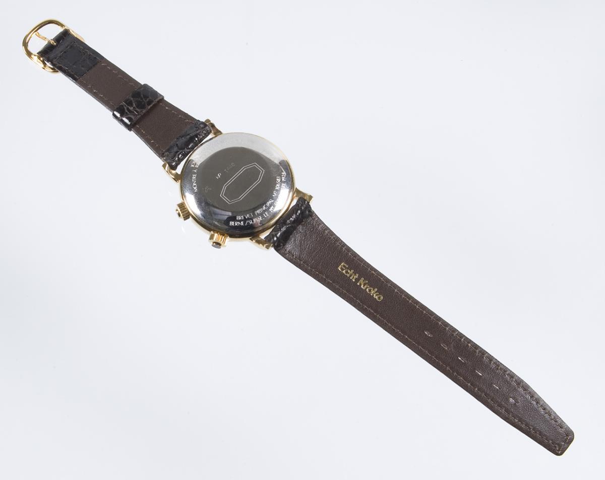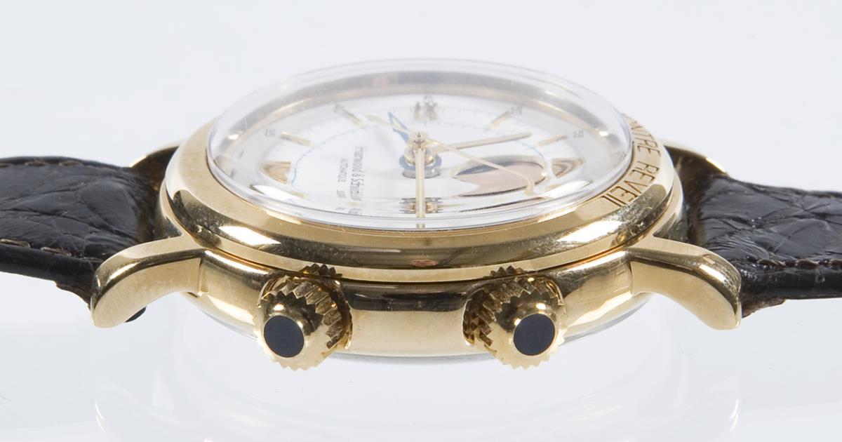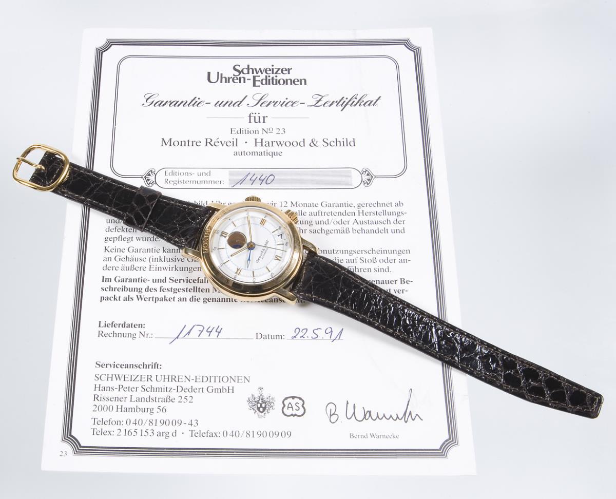Limited, numbered: 1440/1999. automatic movement. Caliber AS 5008. water resistant. 17 jewels. White dial, luminous hands. Large second hand, alarm hand. Moon phase, date window. Leather strap with pin buckle. Certificate, year of sale 1991, instruction manual. John Harwood, 1894-1965, inventor of the automatic wristwatch, patented in 1924. Functioning in short time test.