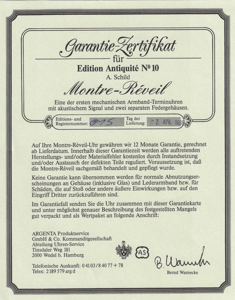Limited, numbered: 15/250. manual winding. Caliber 1475. appointment watch with acoustic signal and two separate barrels. 17 jewels. Silver dial, luminous hour and minute hands. Large second hand, alarm hand. Leather strap with pin buckle. Warranty certificate, year of sale 1986, instruction manual. In short time test functional.