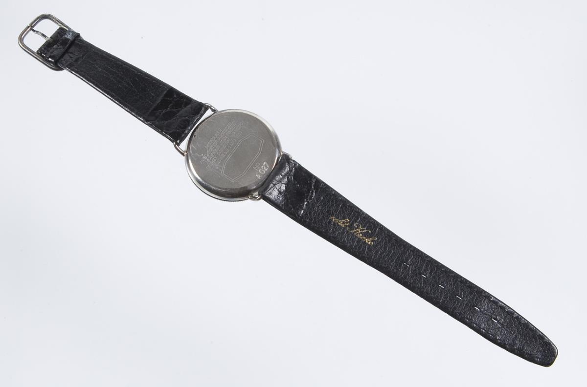 Hand-wound. Numbered: A 027. power duration 35-40 hours. 17 jewels. Water resistant to 30 meters. Over-case with screw cover, in the cover sealing ring. New edition of the first waterproof wristwatch in the world. White dial, blued steel hands, small seconds. Leather strap with pin buckle. Warranty certificate, instruction manual. In short time test functional. Scratches on the back.
