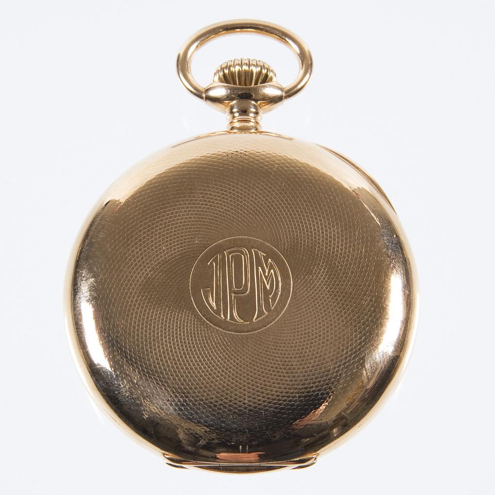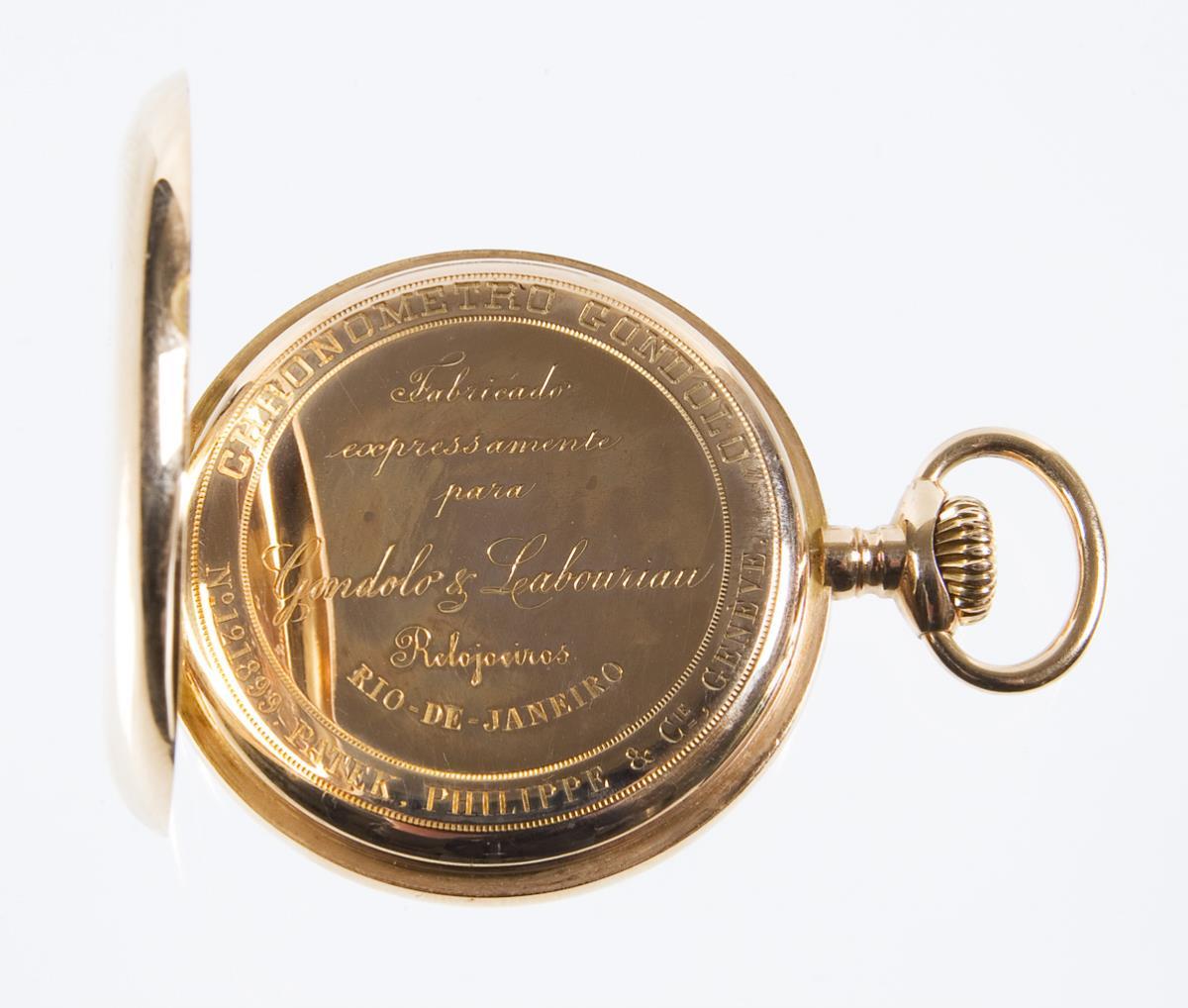 Crown winding. Gold-plated bridge movement with lever escapement and special fine regulation. White dial, black Roman and Arabic numerals, small seconds. Guilloché case, engraved monogram JPM. Neutral glazed wooden case. The Gondolo collection was named after the famous seller Gondolo & Labouriau in Rio de Janeiro, with whom Patek Philippe had close and successful business relations 1872-1927. Functioning in short-term test.