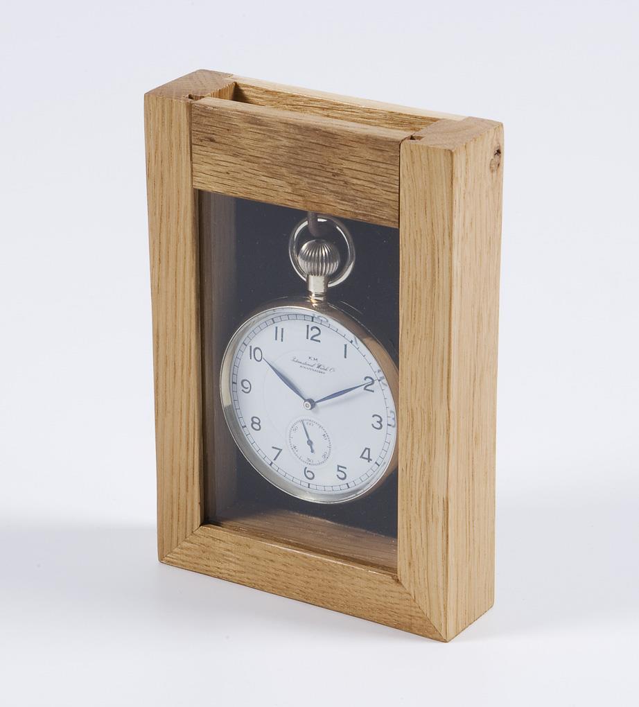 Crown winding. Case and movement signed. Bridge anchor movement. Caliber 67. white dial, black Arabic numerals, blued steel hands, small seconds. Neutral glazed wooden case. Functioning in short time test.