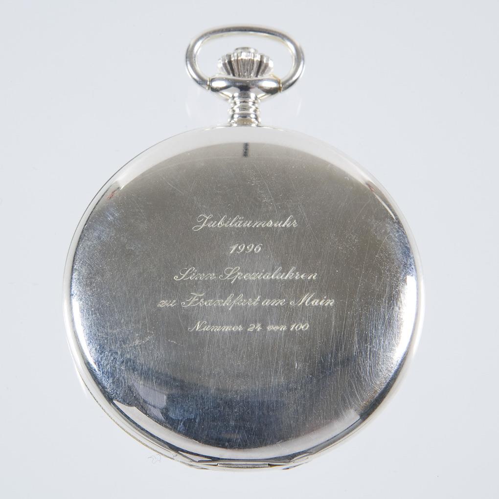 Anniversary watch 1961-1996. limited, numbered: 24/100. crown winding. Glazed Swiss movement with Geneva stripes. 17 jewels. White dial, black Roman numerals, graceful hands, small seconds. Smooth case, engraved on the back. Silver watch chain with lobster clasp and spring ring. Wooden case. In short time test functional.