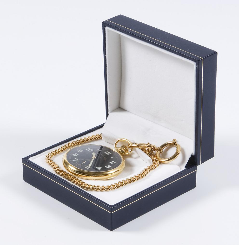 Crown winding. Unitas 6497 caliber. with 17 jewels. Black dial, luminous Arabic numerals and hands, small seconds. Watch chain with lobster clasp and spring ring. Warranty certificate, year of sale 2005, instruction manual. Neutral case. In short time test functional.