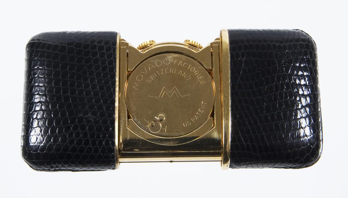 Push case US patent, pulling the case parts winds the movement. Silver dial, Arabic numerals, large seconds, alarm hands. Crowns at 11 and 1. overcase covered with black leather. In short time test functional.