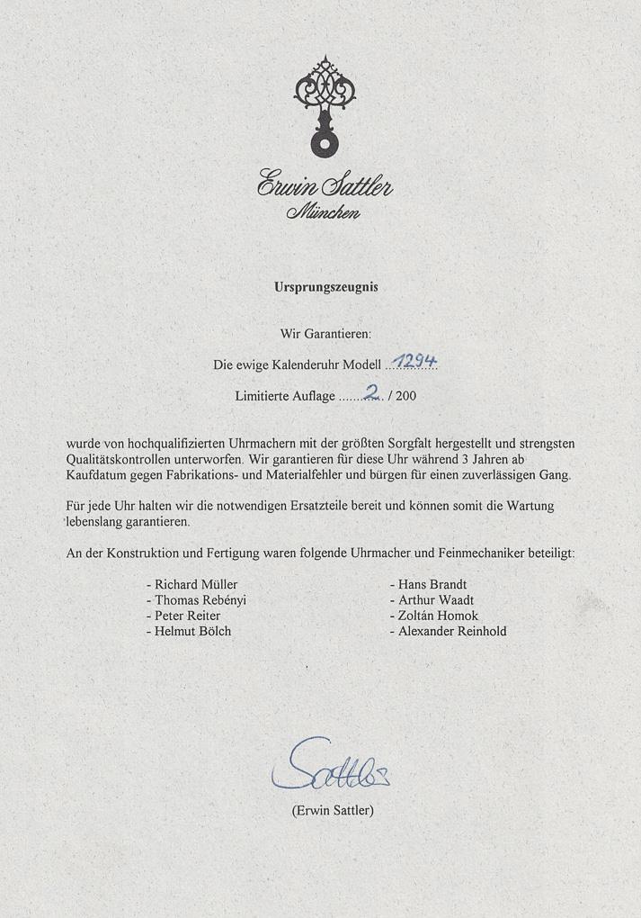 Limited, numbered: 02/200. key winding. Anchor escapement. Caliber 1294. all-round faceted glazed walnut case with boxwood marquetry. Golden dial, black Arabic numerals, blued steel hands. Time display on top, date on bottom. Window for day of the week and month. Certificate, instruction manual. Original key. Original nappa leather case. The movement with perpetual calendar was invented by Heinrich Sattler and placed under the protection of an imperial patent in 1903. In short time test functional.