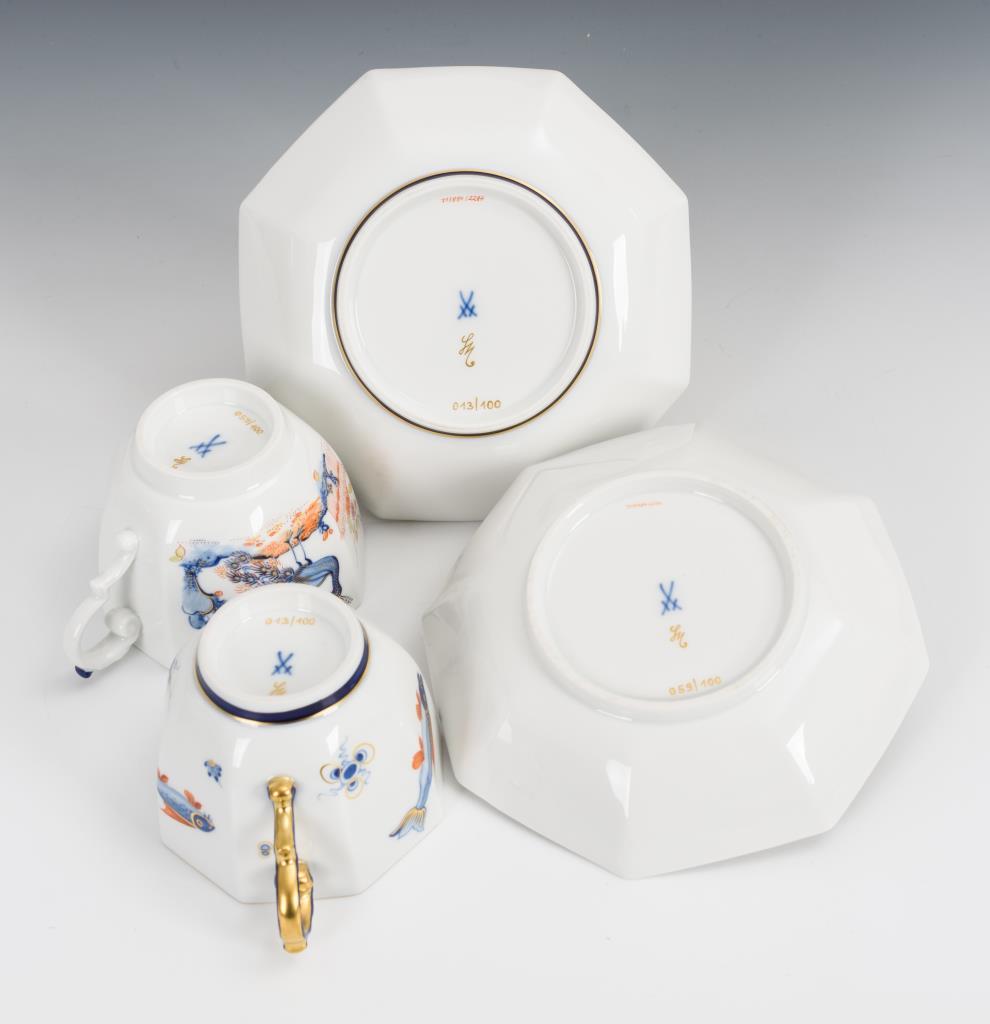 Unterglasurblaue und polychrome Malerei, goldstaffiert.H Tassen 6 cm, Ø originale Untertassen 14 cm.