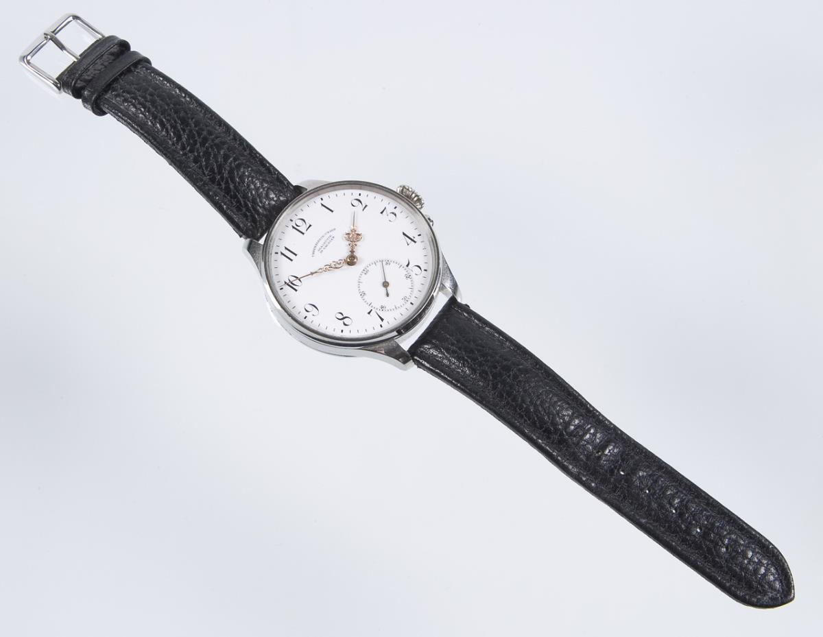 Crown winding. So-called Mariage watch with an old pocket watch movement and a newly adapted wristwatch case. Glazed three-quarter plate movement with lever escapement, swan neck fine adjustment and blued steel screws. White enamel dial, black Arabic numerals, small seconds, openworked hands. Leather strap with pin buckle. Neutral case. In short time test functional. Dial, glass with scratches.