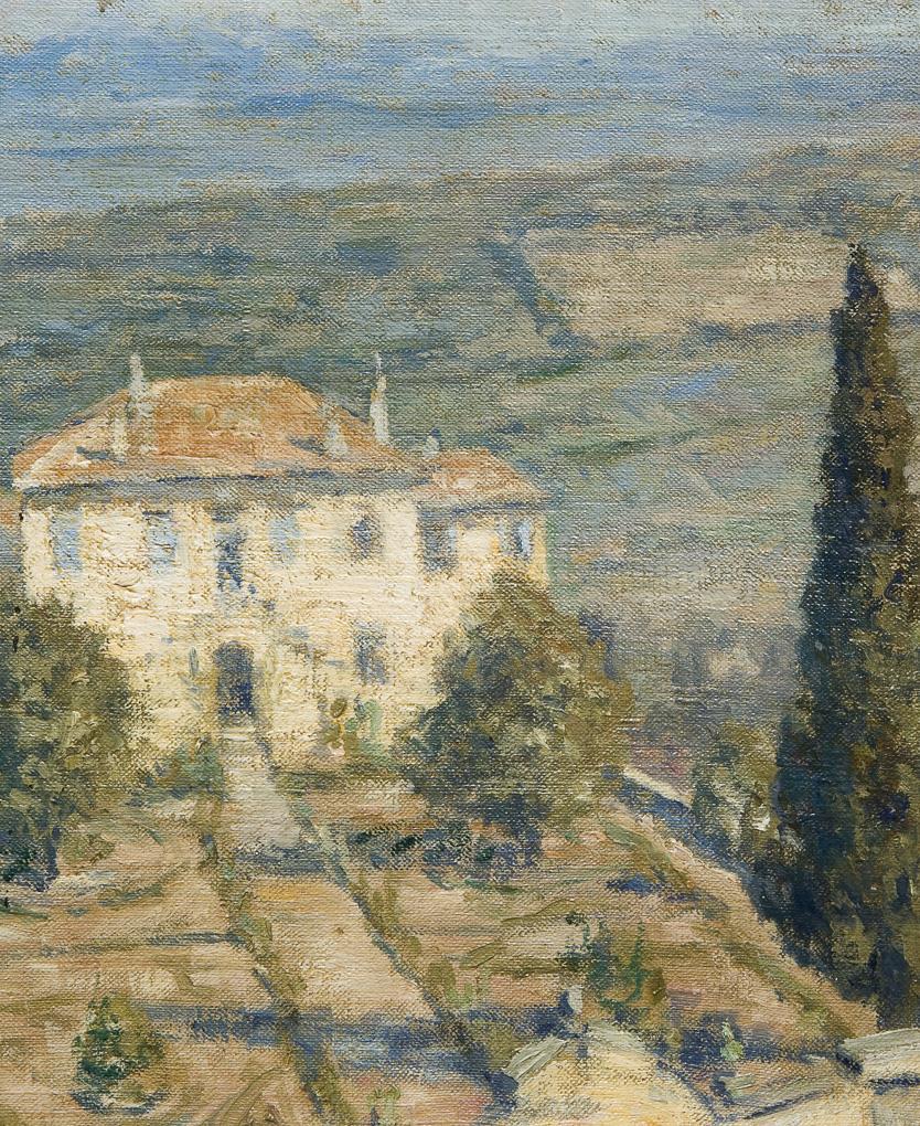 The estate stands in the sunlight of the south. The landscape is attractively structured compositionally. Profiled gold frame with adhesive label of the Renz brothers, Stuttgart.