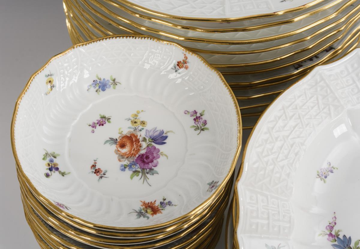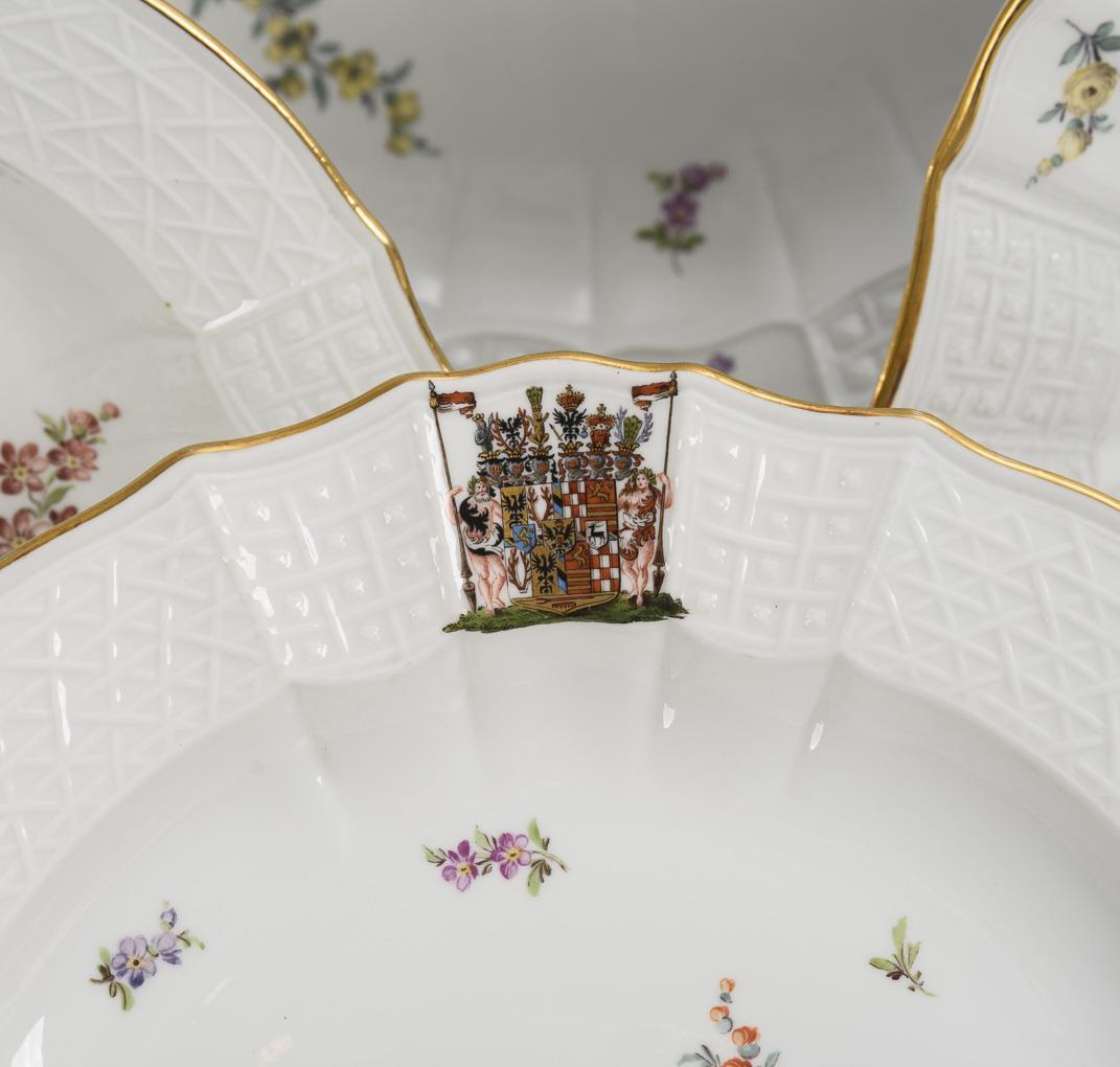 The service is a special production for the princely house of Schwarzburg-Rudolstadt. The relief decoration "Alt-Brandenstein" was first made around 1740 at the Meissen Porcelain Manufactory for Friedrich August Brandenstein, who was promoted to head kitchen master in 1739. In 1744, the modeller Johann Friedrich Eberlein (1695-1749) revised the relief, giving the bars an s-shaped curve and adapting the shape, now called "Neu-Brandenstein", to the taste of the Rococo period. Meissen porcelain was also in use at the court of the princes of Schwarzburg-Rudolstadt until the middle of the 18th century, but then - probably for reasons of cost - Johann Friedrich von Schwarzburg-Rudolstadt (1721-1767) had the service with the Old Brandenburgstein relief made by the Aeltesten Volkstedter Porzellanmanufaktur. The decorations of this court dinner service and the present service owned by Princess Anna-Luise of Schwarzburg-Rudolstadt are thereby identical: in a reserve piece, the coat of arms of the princely house as well as floral bouquets, scattered flowers and gold borders.