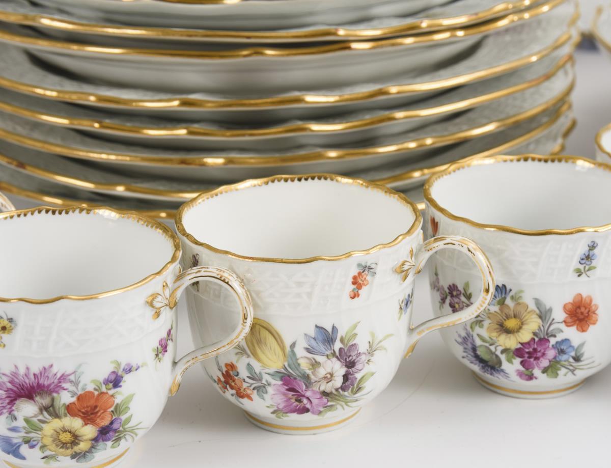55 parts. Form "Altbrandenstein" and "Neubrandenstein". On the flag in each case the coat of arms of the Principality of Schwarzburg-Rudolstadt, in the mirror and on the flag bouquets of flowers and scattered flowers. 12 dinner plates, 12 soup plates, 2 bowls (Ø 24 cm), 2 vegetable plates (Ø 30.5 and 36 cm), 2 different oval plates (L 35 cm), 12 demitasse cups and 13 saucers. 1 bowl with minimal edge chip, chip on the standing ring of 1 bowl, 1 plate with abrasion on the underside, minimal gold abrasion on the oval plates.