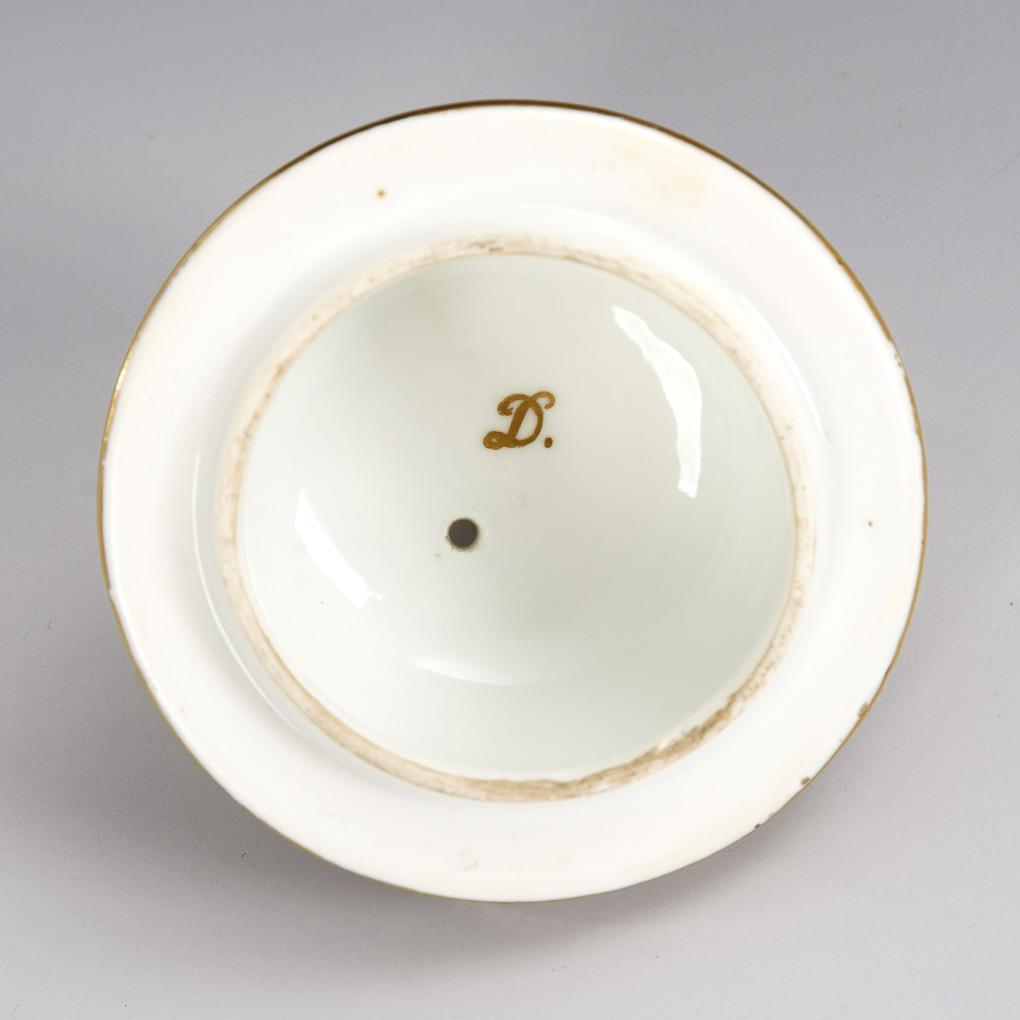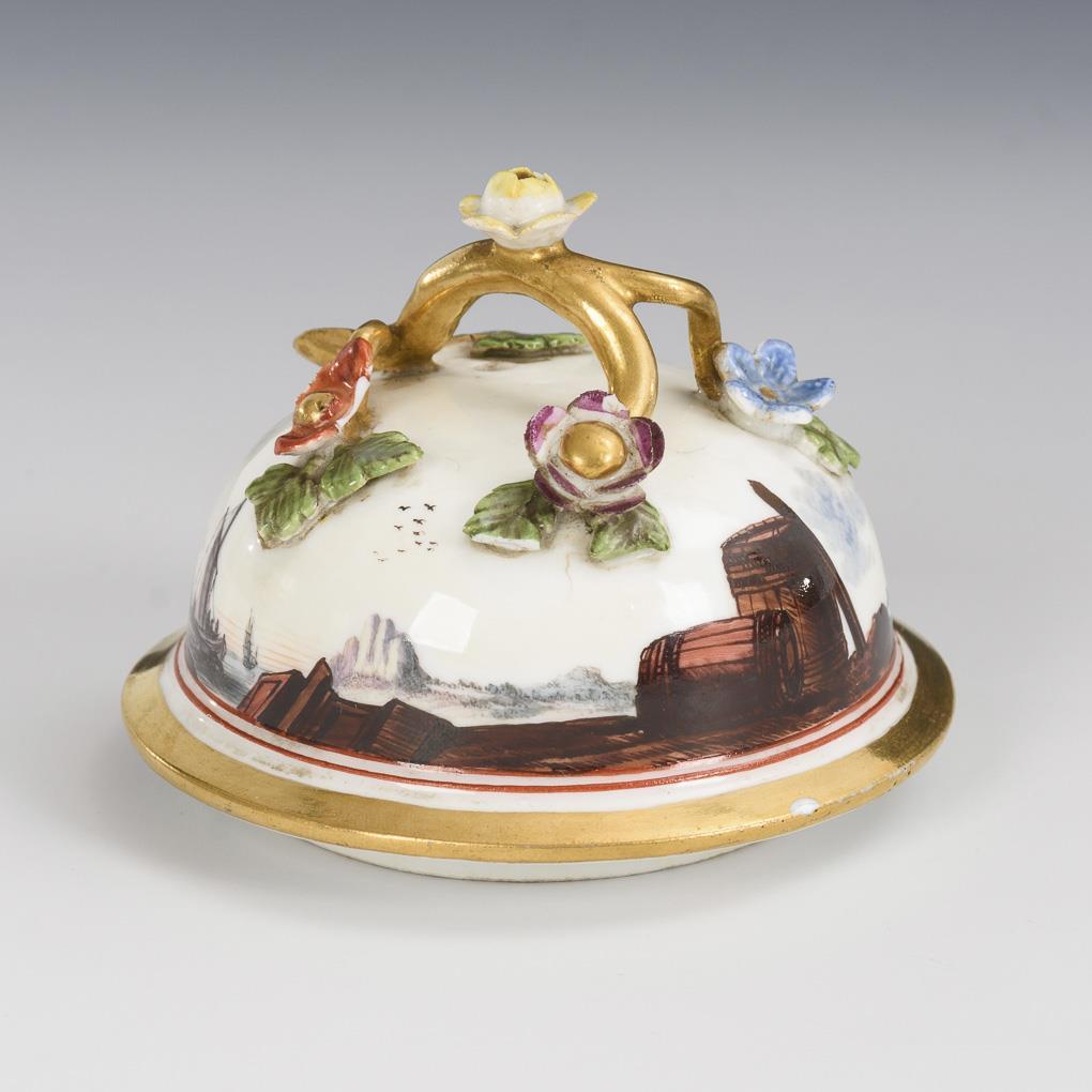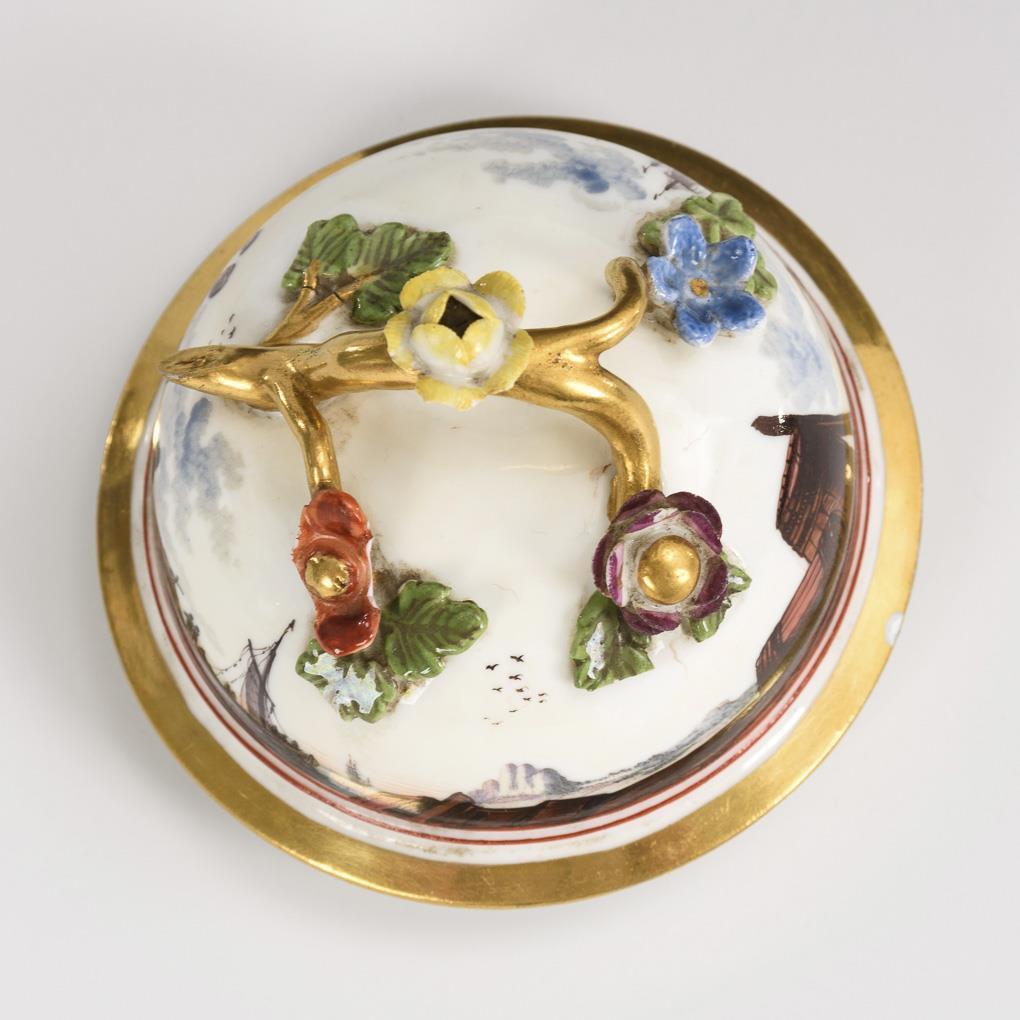 Lid with floral branch handle and a surrounding painted harbor scene with sailing ships, merchants and goods. 2 flowers and 3 leaves bumped, minimal chip on the edge of the lid.
