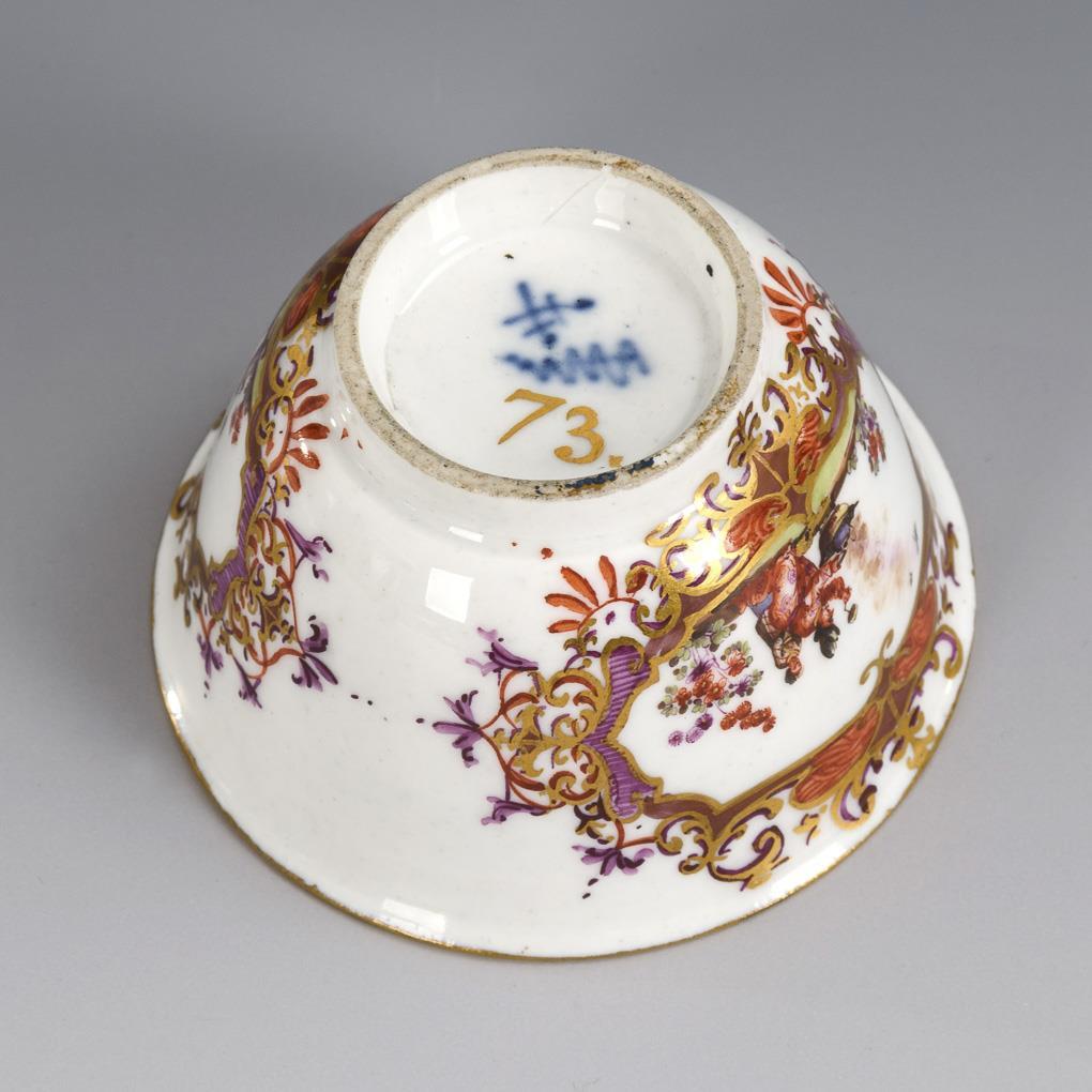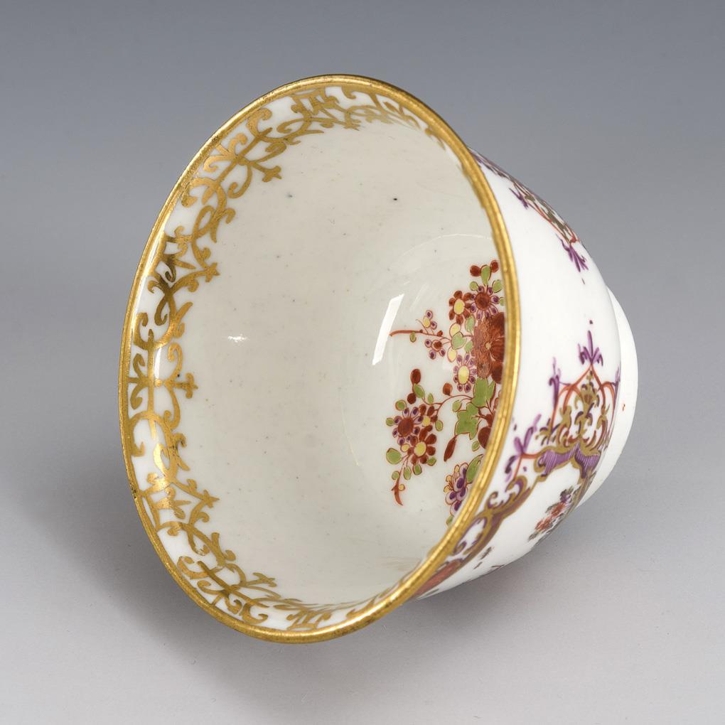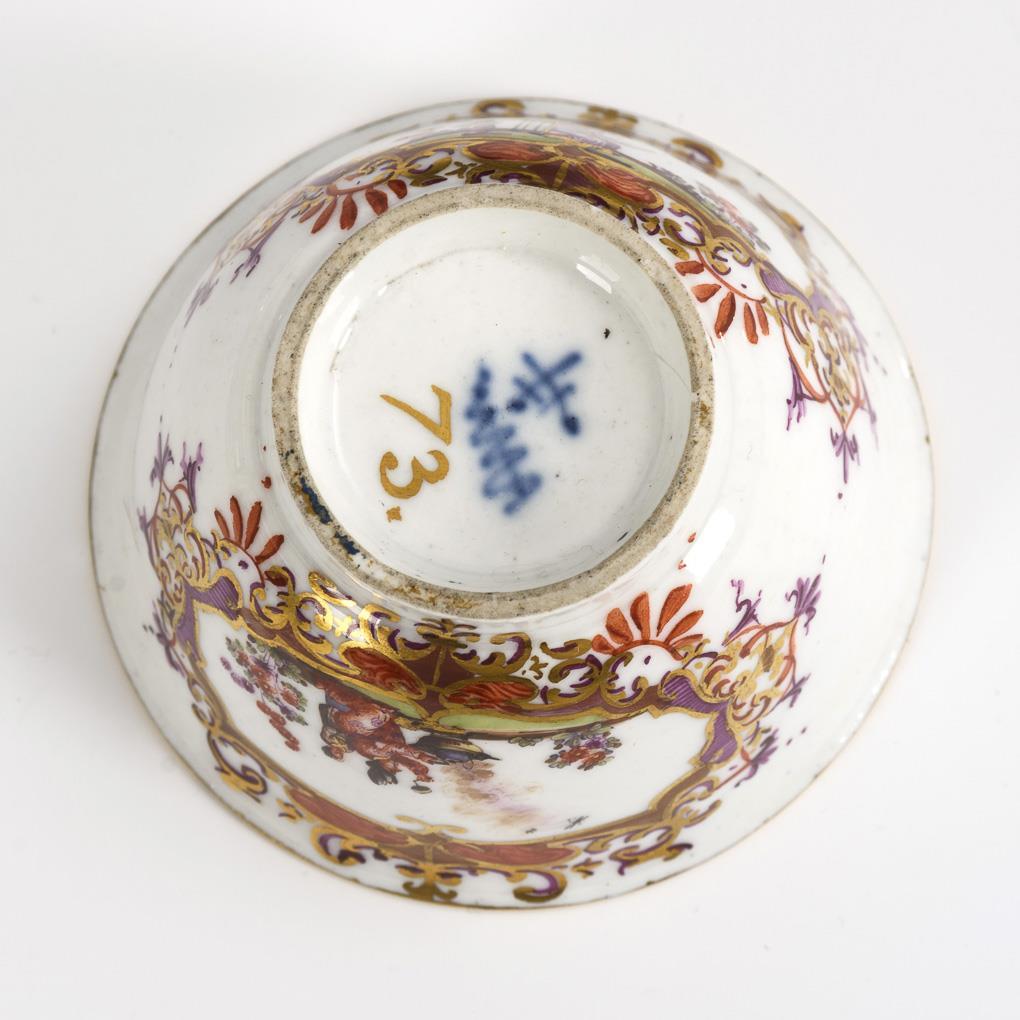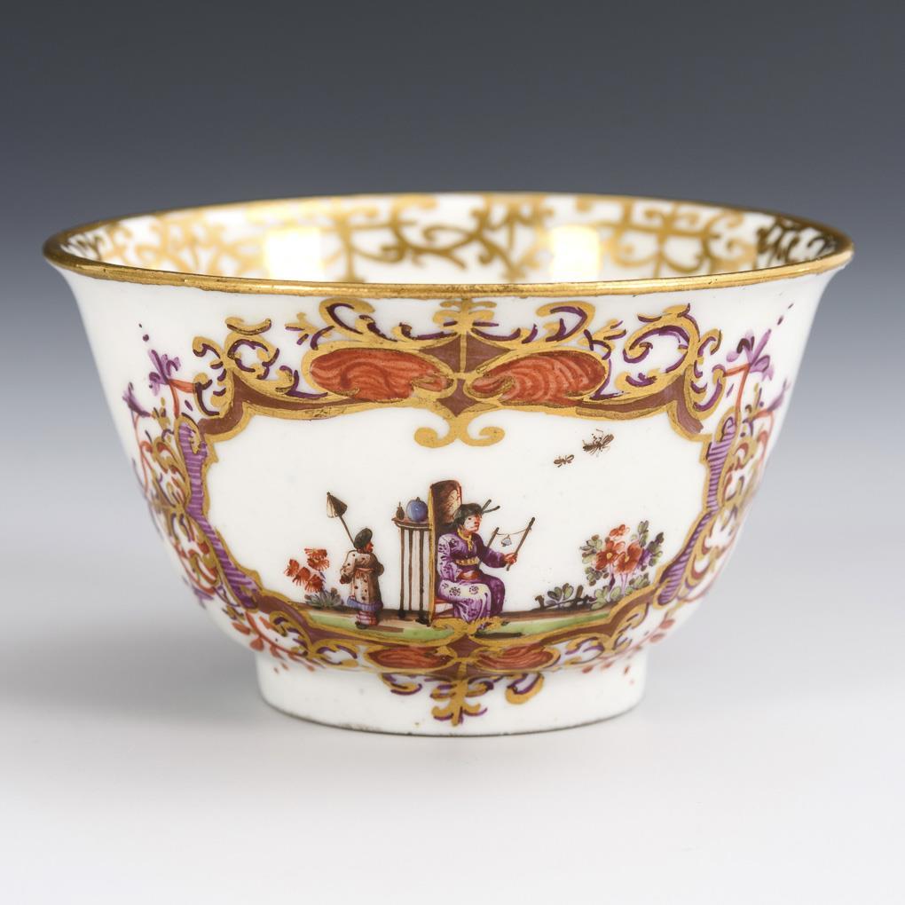 Decoration in the manner of Johann Gregorius Höroldt (1696-1775). On both sides on the Koppchen a multi-pass cartouche with finely painted Chinese scenes, cartouche framing with chandelier fields, gold lace from bandelwerk at the mouth edge.