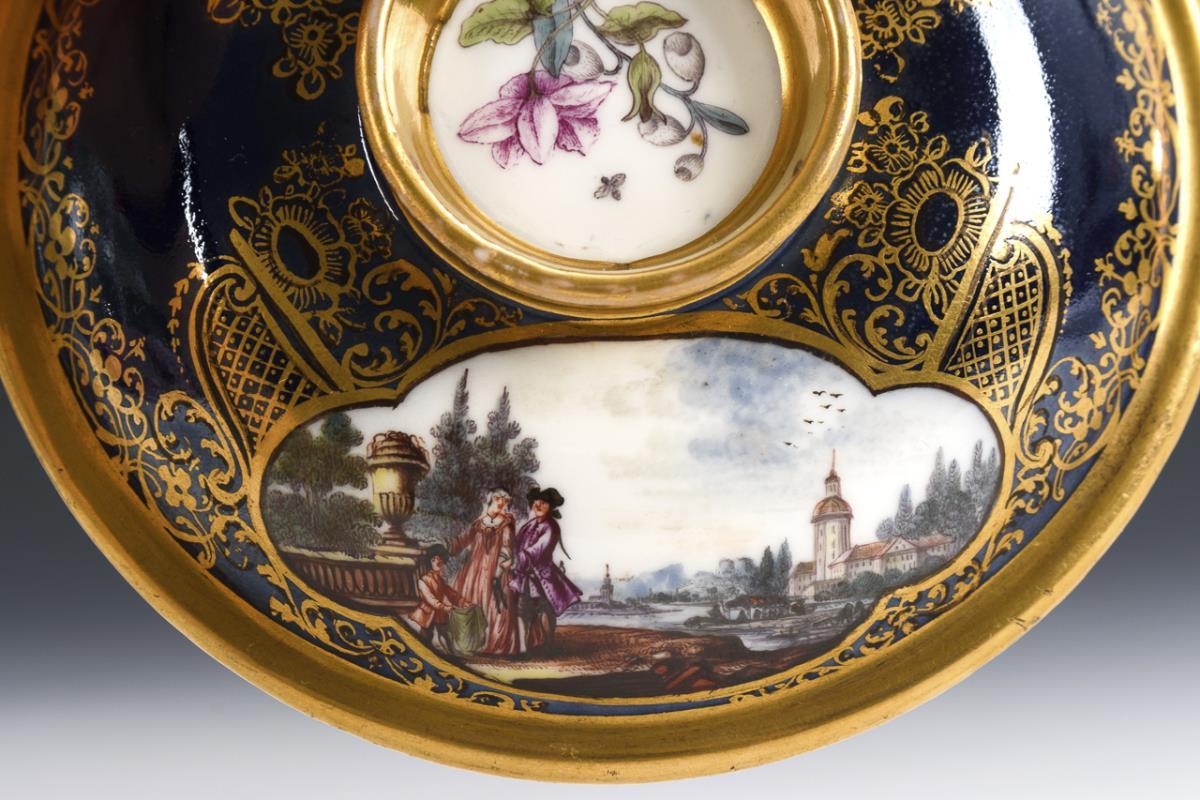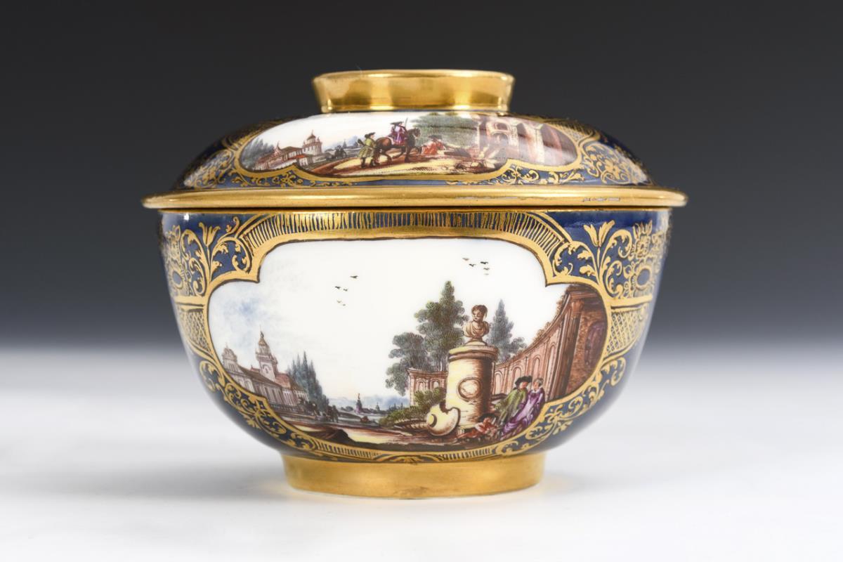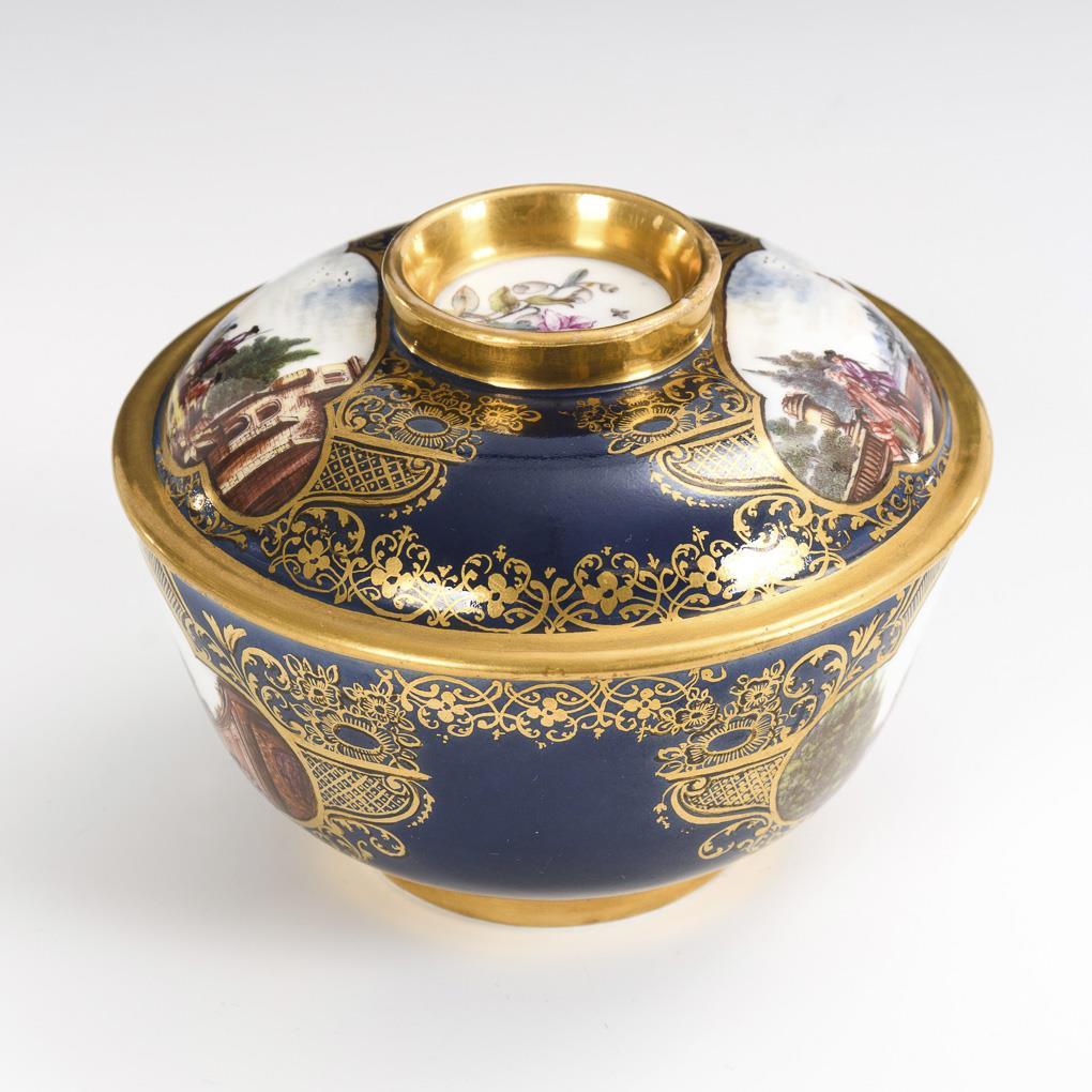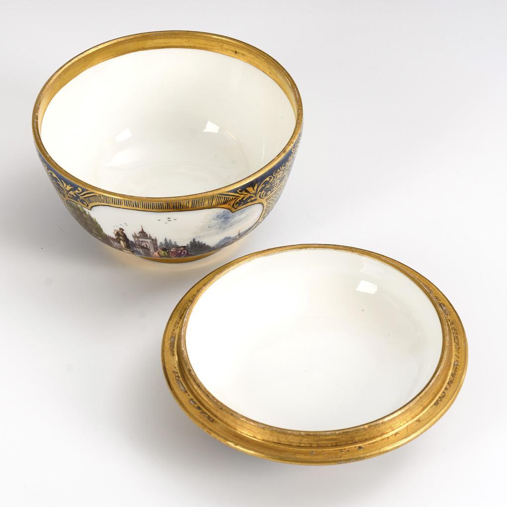 Rare box with ornamental gold painting on cobalt blue background. In each of the 2 quatrefoil cartouches on the wall and lid quality painted landscapes with architecture, equestrian scenes and staffage of people. The form, which resembles the maternity tureens, is based on Asian models. The lid with high gilded handle ring can be used as a bowl. Very good condition, minimal gold wear on the edge of the lid inside.