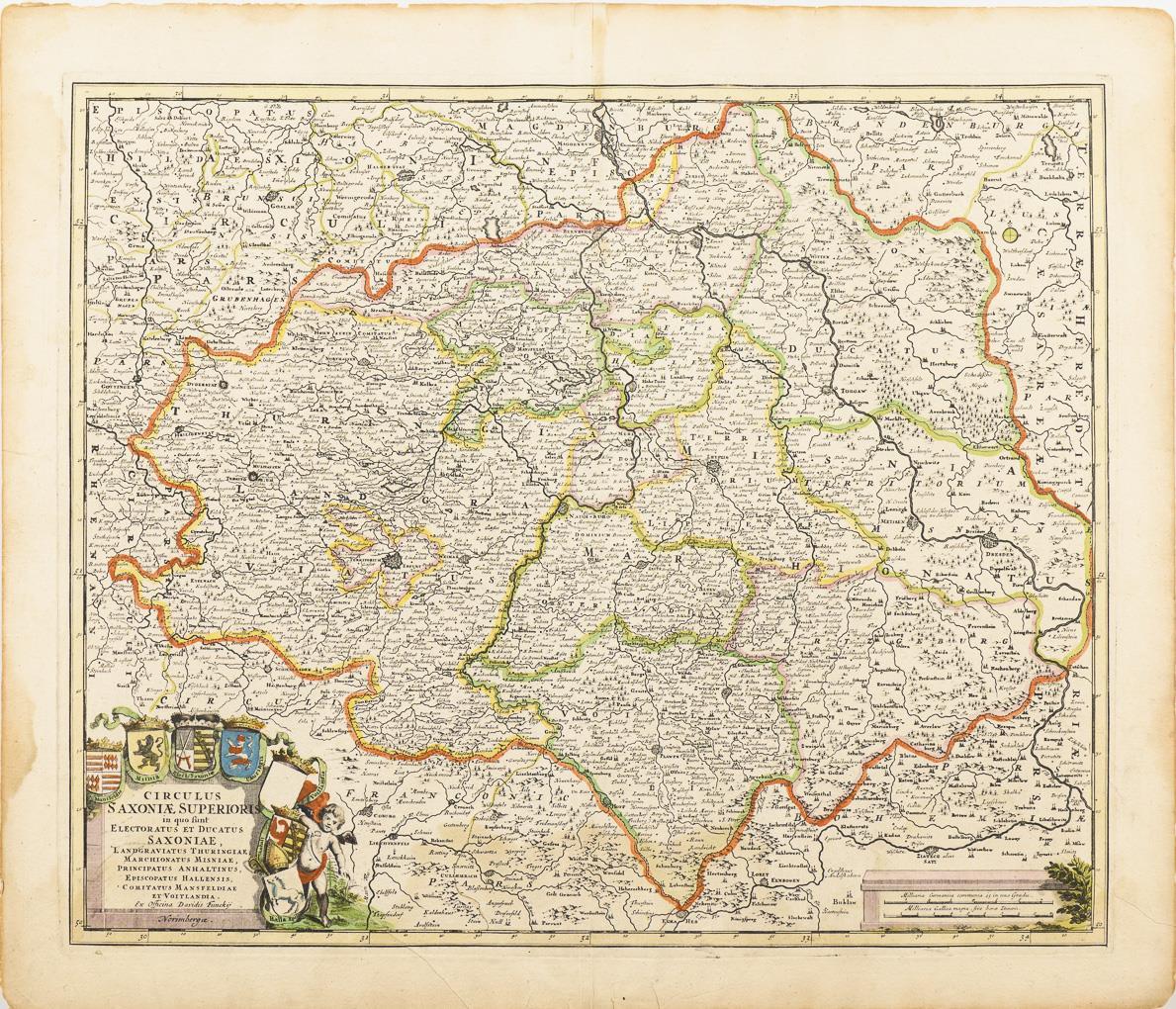 Historical map of the Upper Saxon Imperial District and surrounding area, figural title cartouche with coats of arms of Mansfeld, Meissen, Saxony, Thuringia, Vogtland, Anhalt and the Saxon horse "Circulus Saxoniae Superiroris in quo sunt electoratus et ducatus Saxoniae [...]". Buck crease with backstaining, marginal area with water damage.