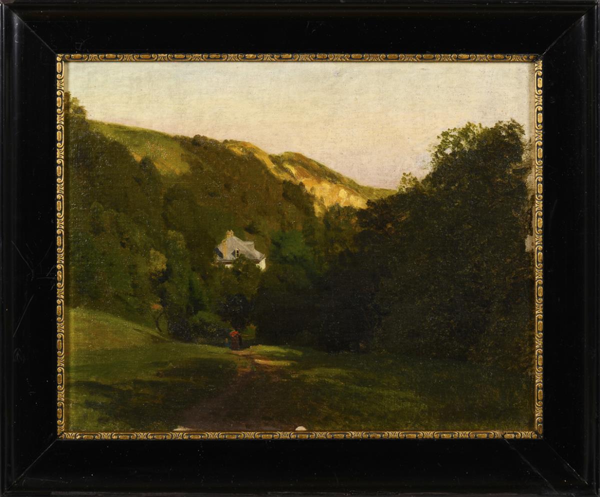 Staffage on a path near a house amid the trees on the forest slope in the mountains. Minimal signs of age.