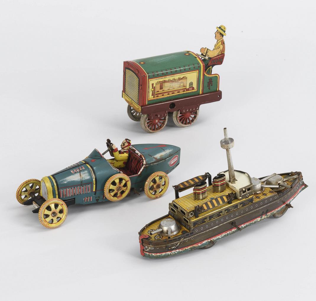 Racing car Bugatti "I-970" in box "Sparking Racer 211". / Tin ship "1038". / Locomotive "Dinky Supertoys 1057" with driver. Clockworks intact, without key. Sheet metal and boxes with artificial signs of aging.
