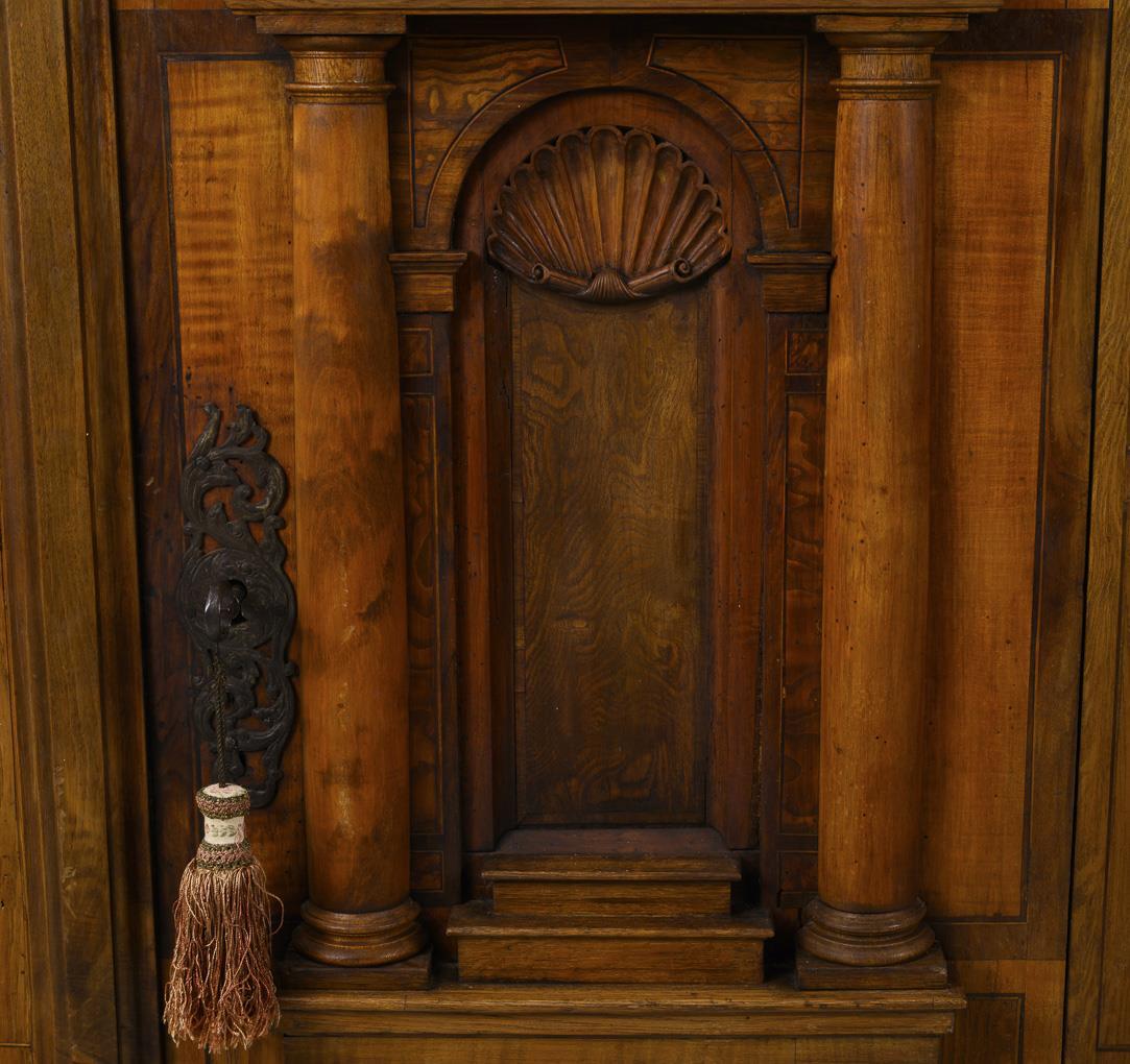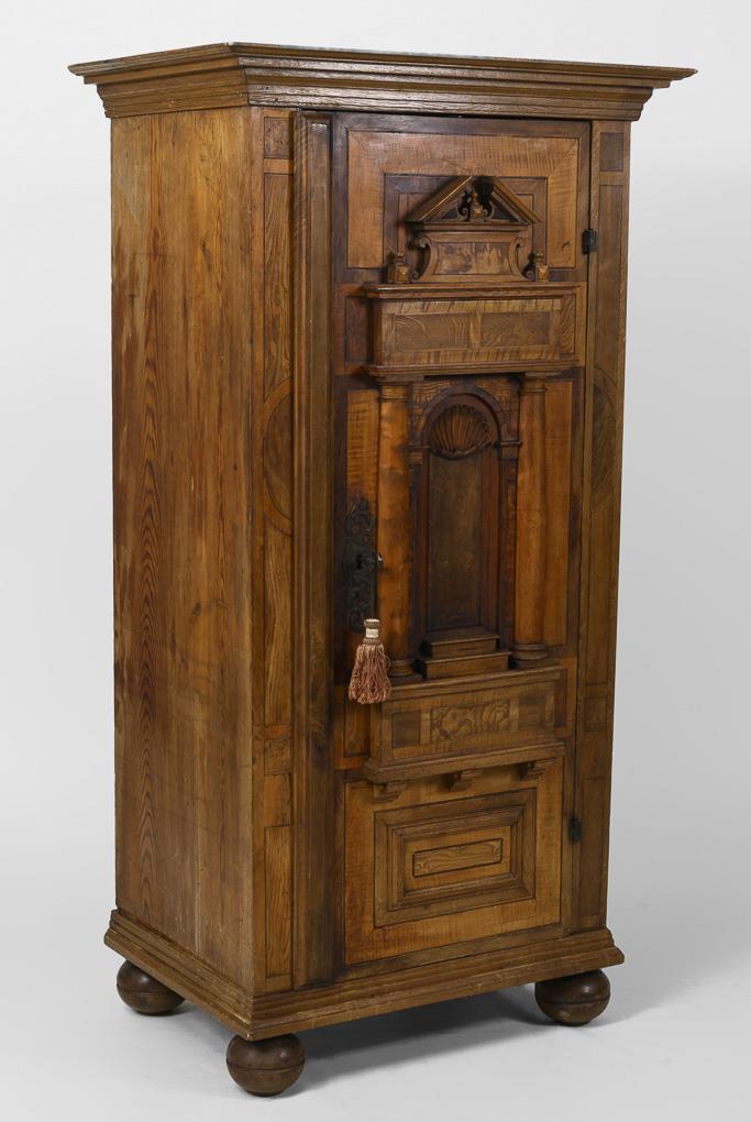 Slim, elegant 1-türiger cabinet with plastic veneered Renaissance facade division of walnut, in the form of a Ädikula with shell, halfäulen and sprinkled gable, probably using old parts, body coniferous wood. Old lock with key. Back panel defective, ball feet loose enclosed (1x broken), age / signs of use.