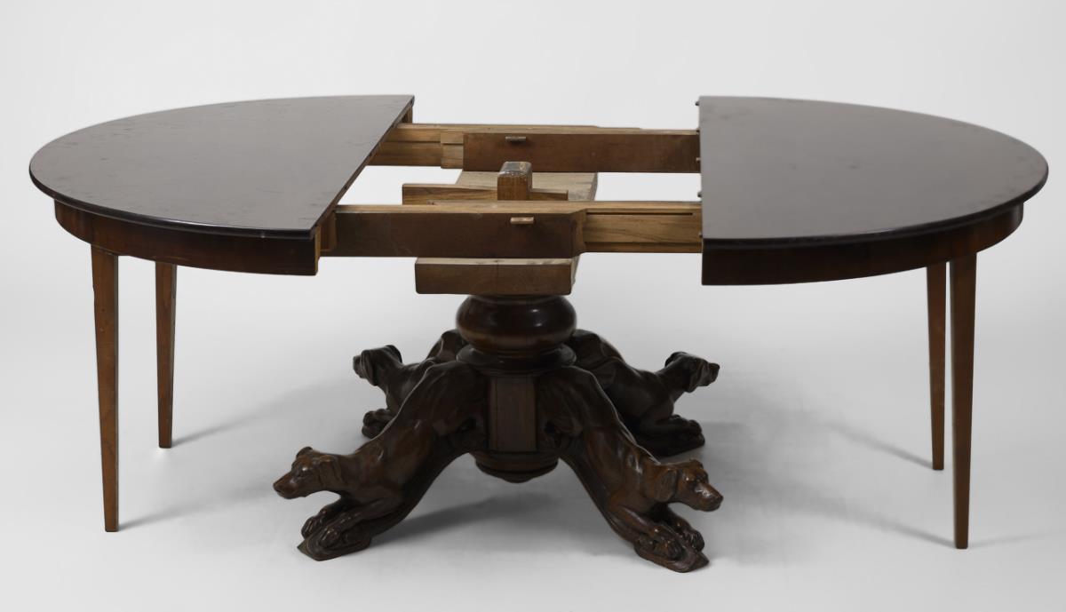 Round table extendable to a banquet table on baluster center support with 4 fully plastic hunting dogs; with retractable additional supports. Signs of age/use, veneer with small defects, 1 dog restored.