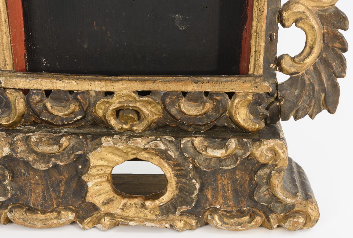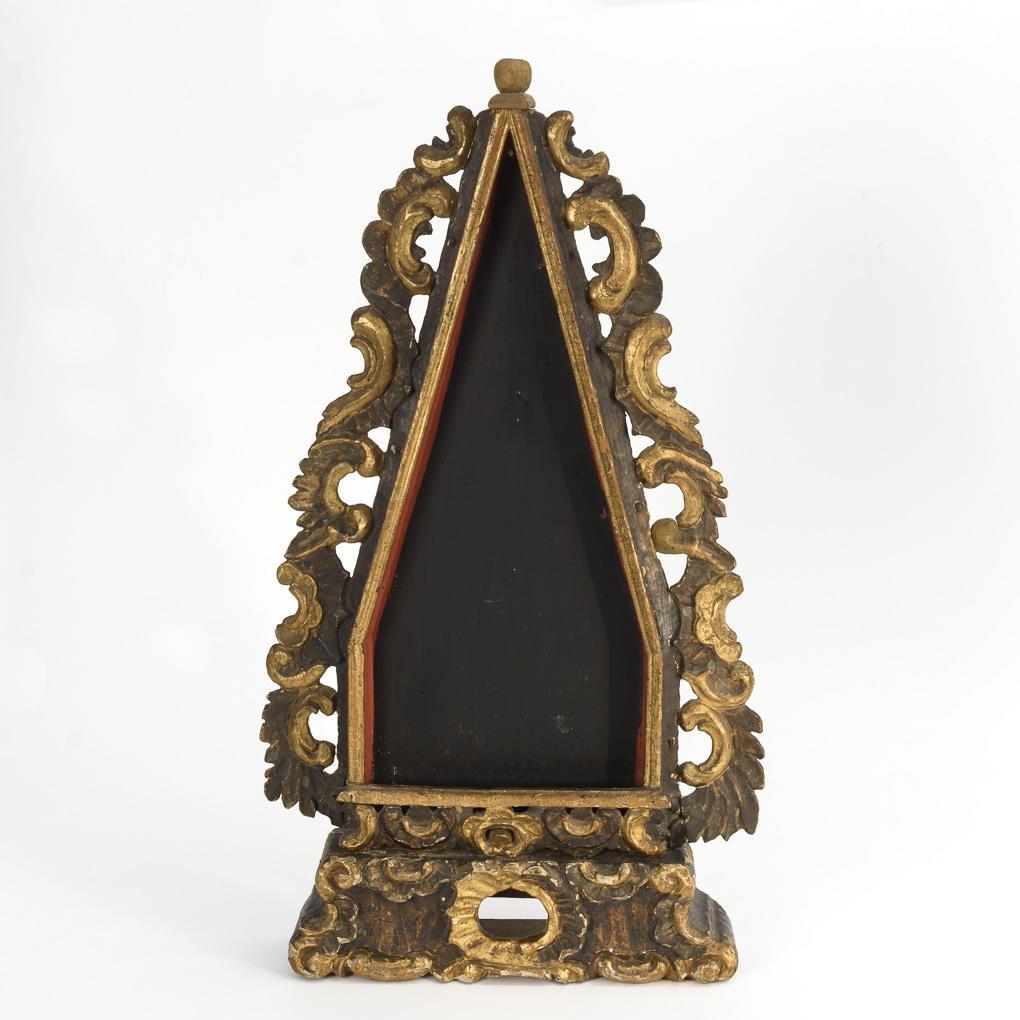 Richly decorated with rocailles and foliage reliquary aisle and pyramidal showcase structure. Reliquary/glazing missing, 2 small additions, in need of restoration.